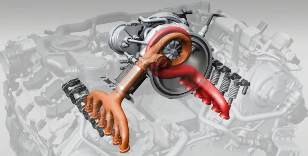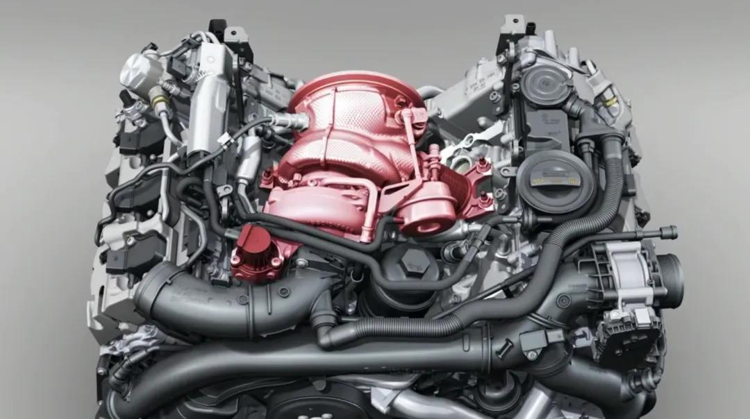 奥迪的发动机这次变化也很大,它放弃了EA837的机械增压,转而加入涡轮大军。但奥迪没有像奔驰保时捷那样把涡轮放在气缸两侧——这不就得用双涡轮了嘛,成本+1对吧,所以奥迪是把气缸夹角打开到90度,在掰开的缸体之间,硬放进去一个涡轮。
