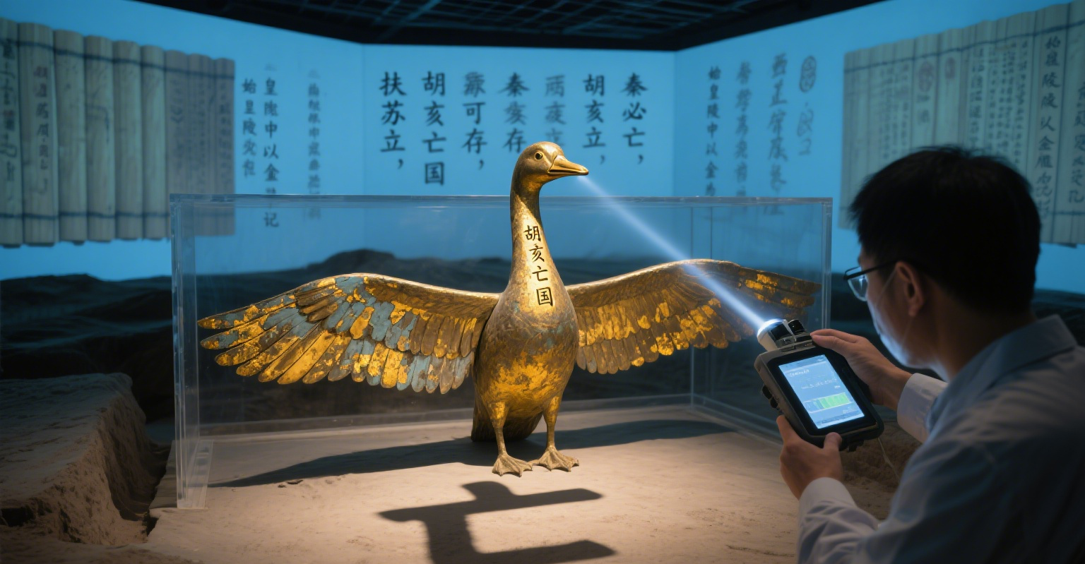 在秦始皇陵考古现场,一件鎏金铜雁引发专家热议。这件按照1:1比例铸造的青铜雁,竟与《西京杂记》中“始皇陵中以金雁为记”的记载吻合。更令人震惊的是,雁喙处刻着“胡亥亡国”四字,这与《赵正书》中“扶苏立,秦可存;胡亥立,秦必亡”的预言形成呼应。
