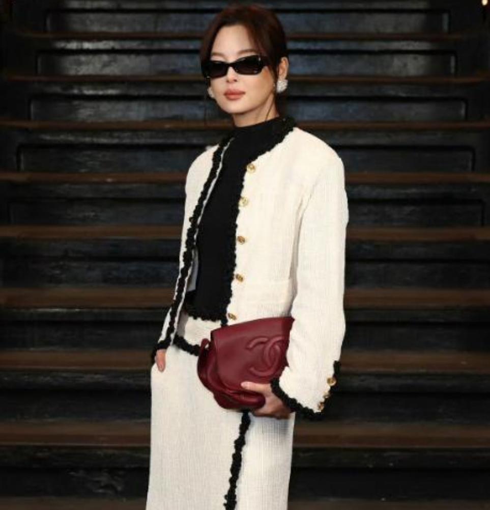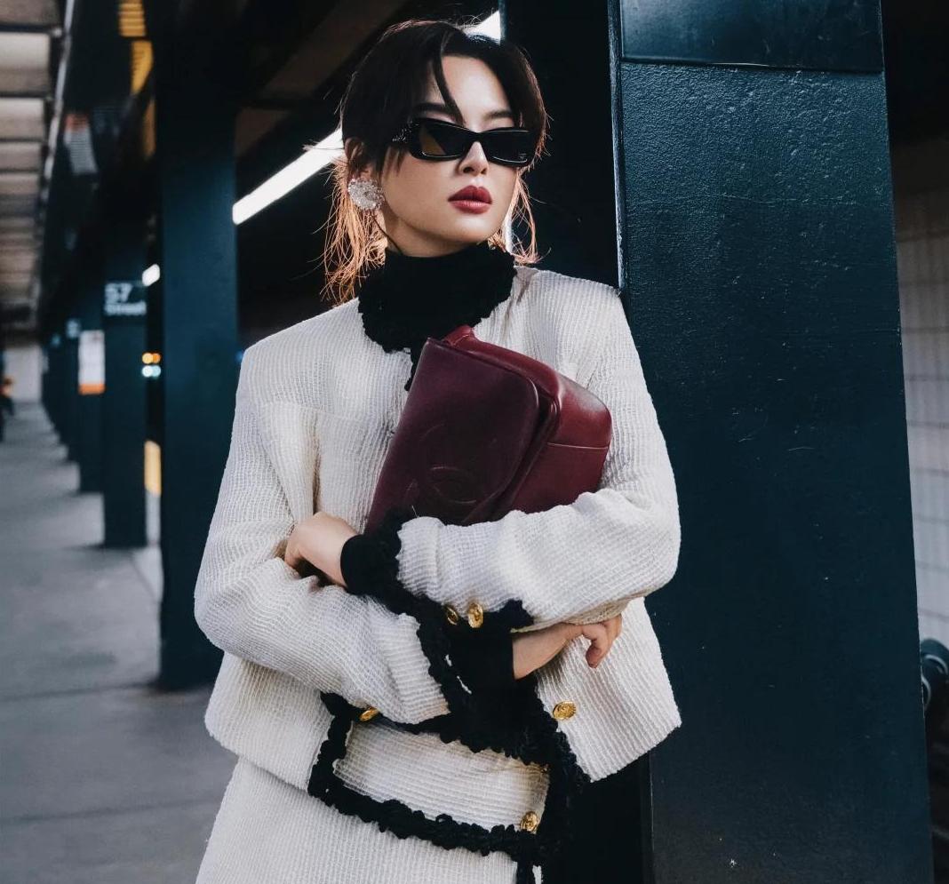 此次一身白色斜纹软呢套装,搭配酒红色手袋,简约中尽显“又美又飒”的高级气质。