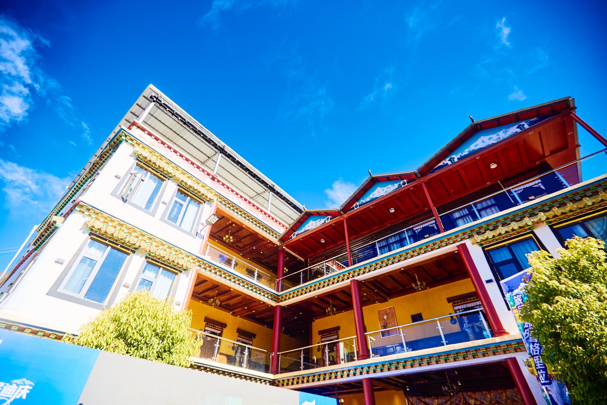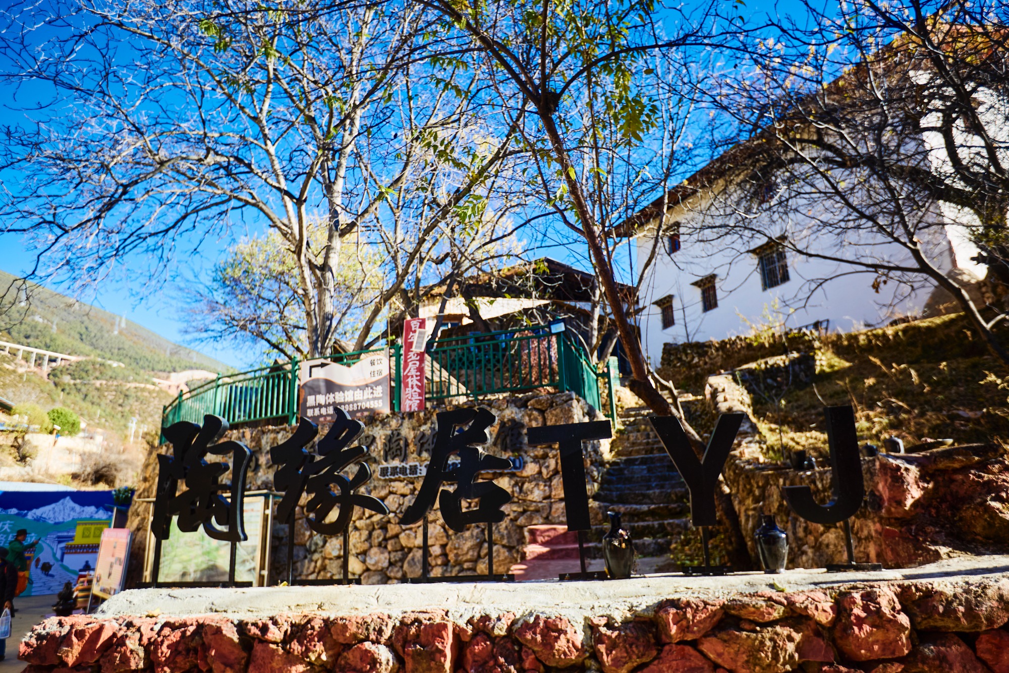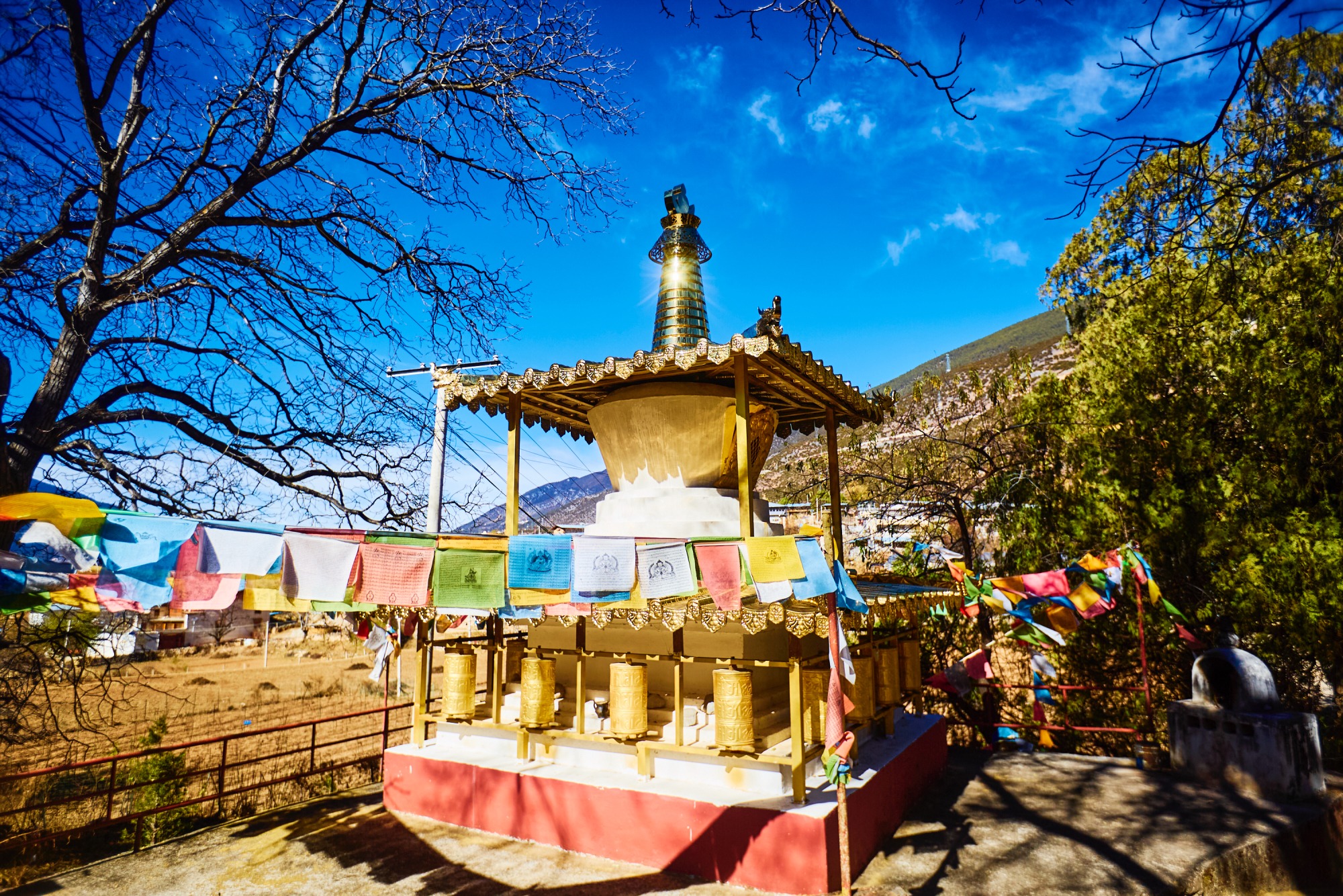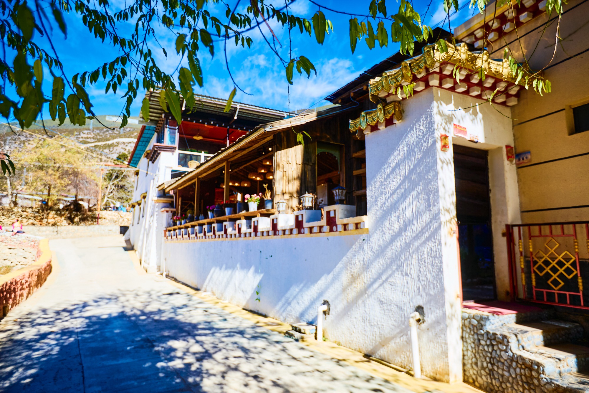 白墙金饰的藏式小楼搭配石砌围墙,粗犷中透着细节上的精致,在湛蓝天空的衬托下格外亮眼。