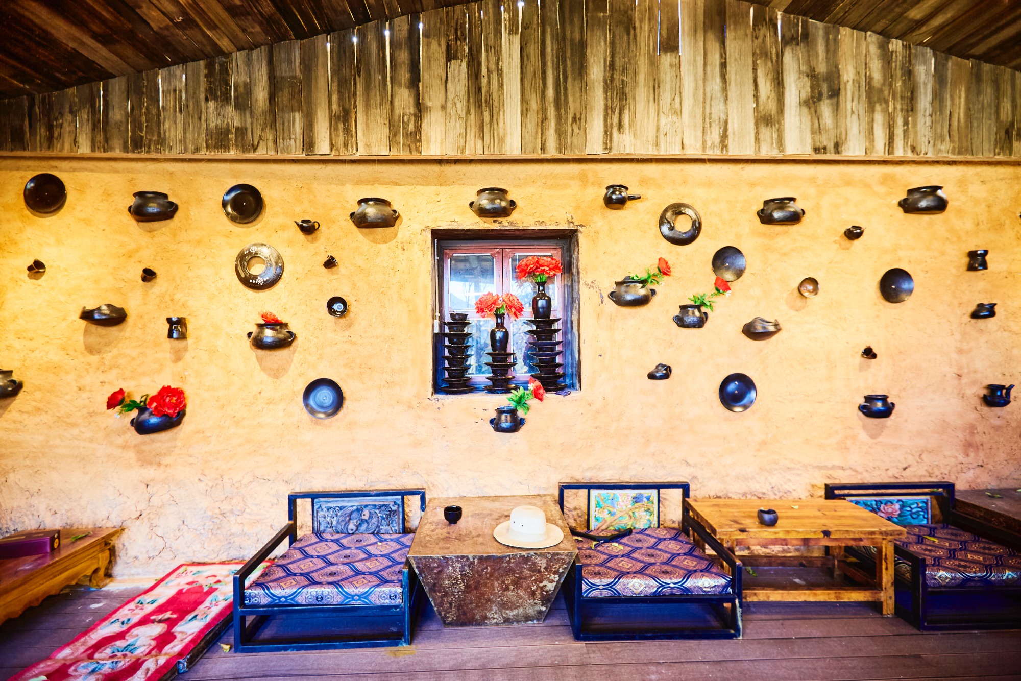 各种黑陶器具装饰着墙壁,从实用的茶具到精美的桌上摆件一应俱全,搭配上藏式家具,展示空间也有了生动的烟火气。
