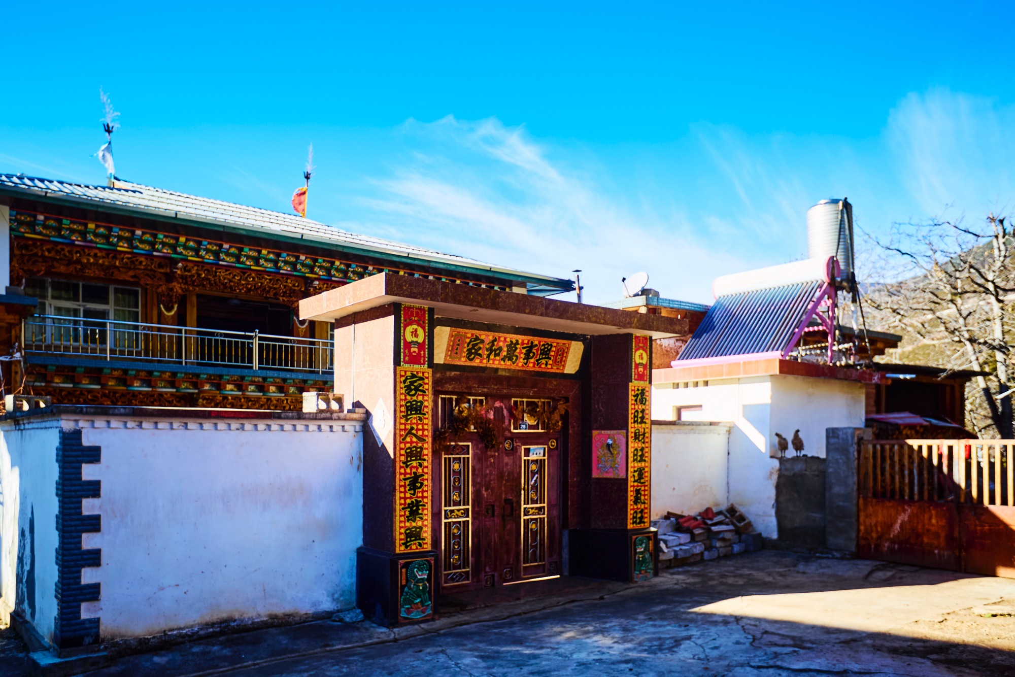 规规整整的白色院墙围着彩色藏式民居,大门口贴着“家和万事兴”的春联,这样的场景总能让人感受到浓浓的生活气息。