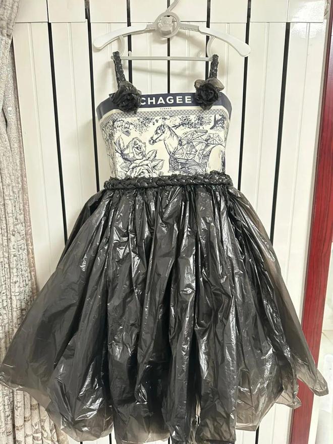 如果没有那么多奶茶袋,裙子还可以用黑色垃圾袋制作。记得处理好奶茶袋边缘,避免划到孩子皮肤。