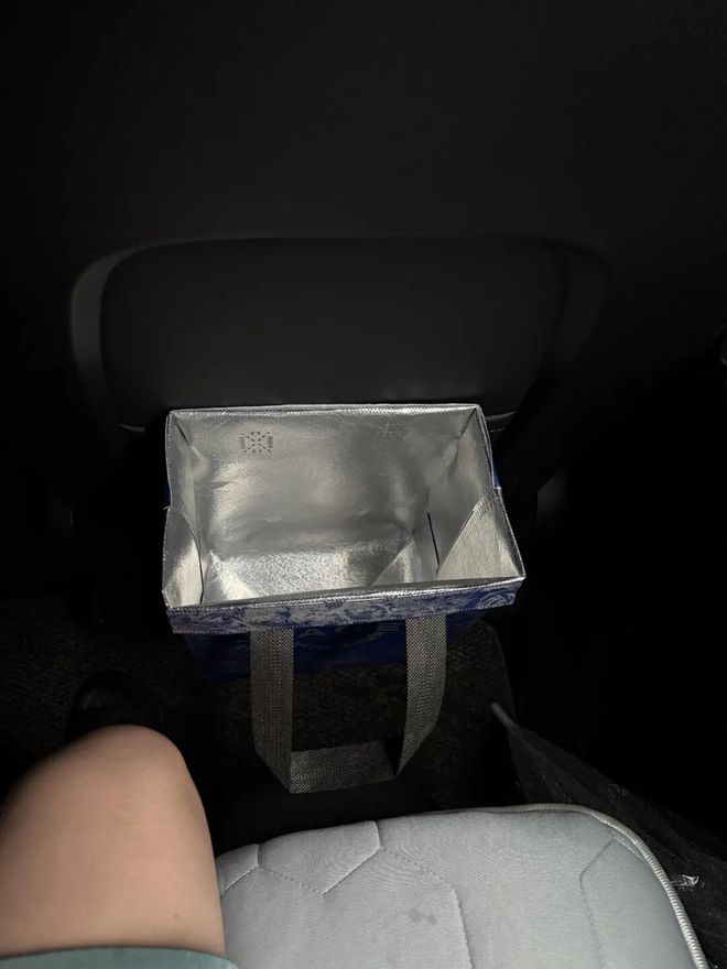 车里吃东西,垃圾没地放?直接把奶茶袋借口外翻,然后塞进椅背口袋里,一个简易的垃圾桶就有了。