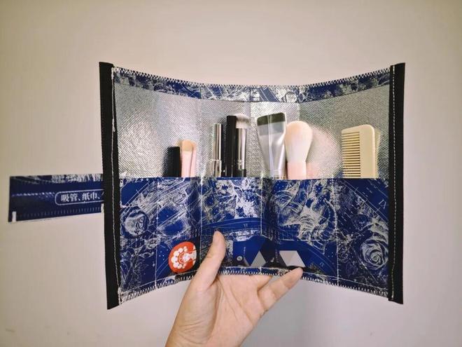自带防水层的奶茶袋,最适合用来改造化妆包了。只需要动动小手,就能装下日常用的化妆小物了。