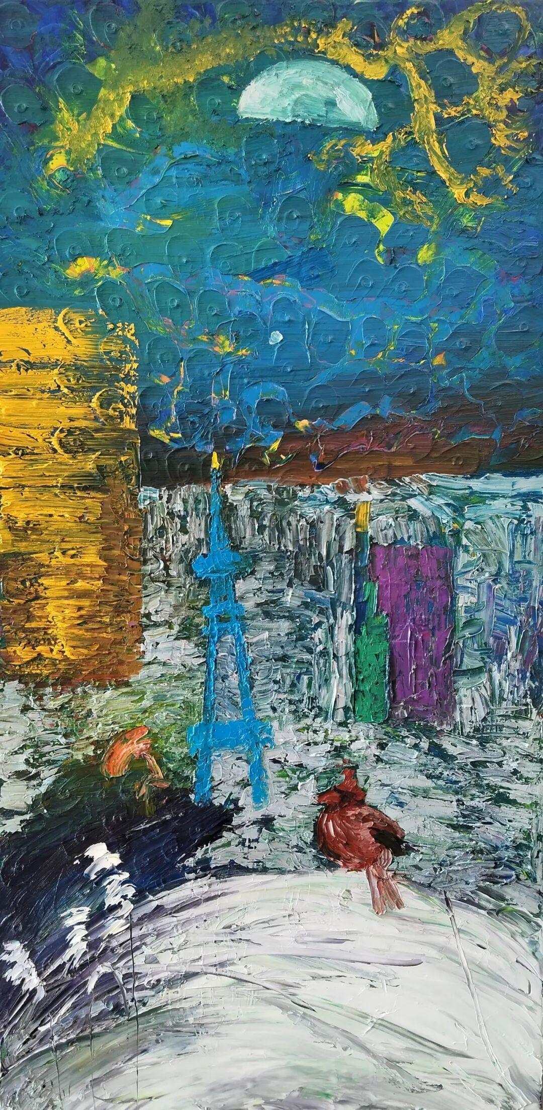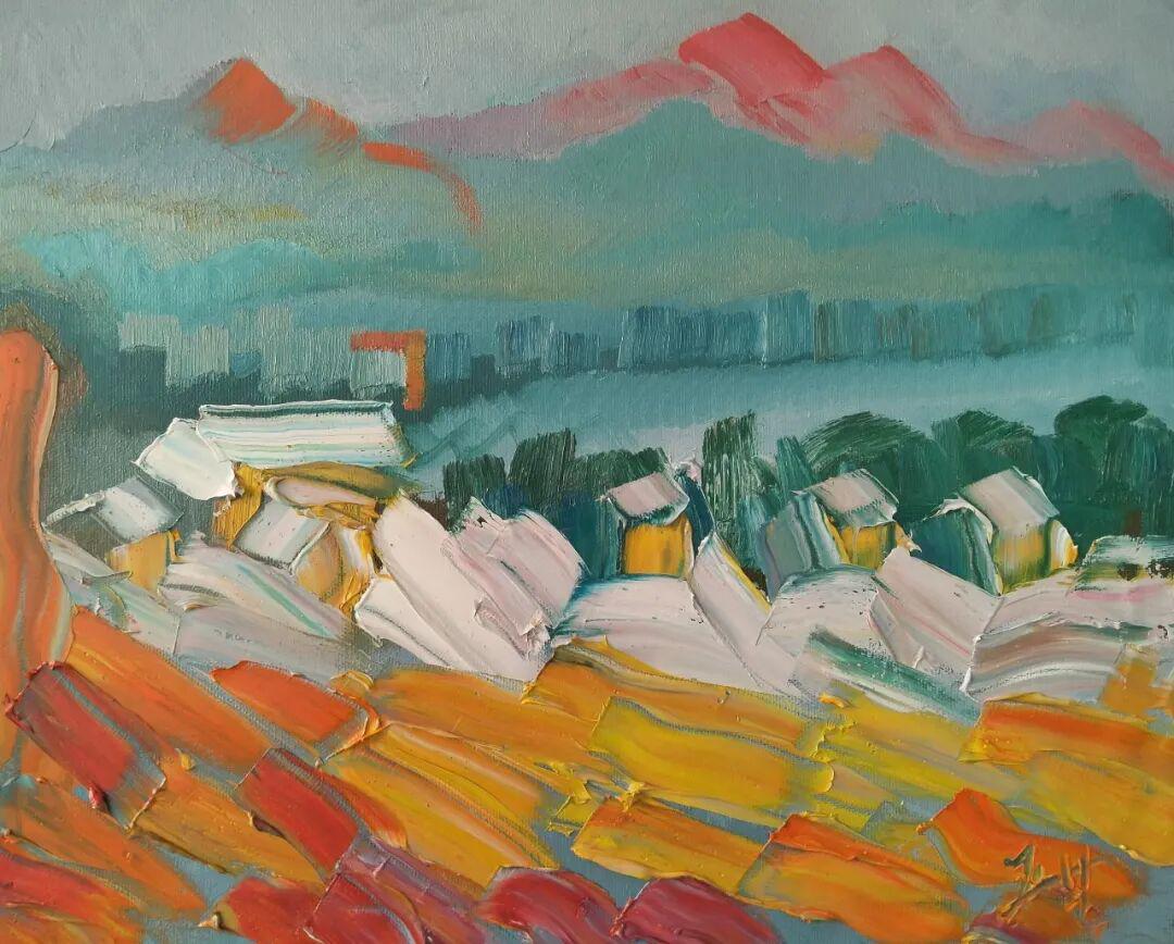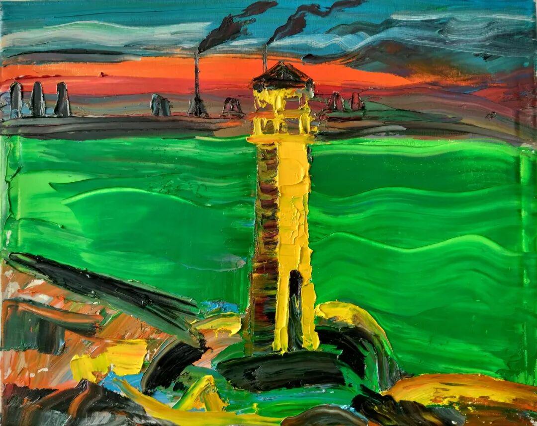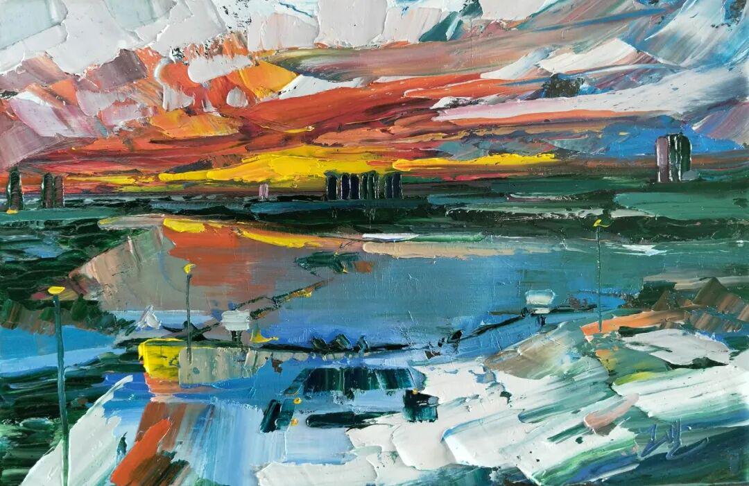 万宝湖,是百湖之城最耀眼的一抹亮色,这幅油画则将这份璀璨凝于画布之上。浓烈的红橙霞光如锦缎泼洒长天,与湖面澄澈的蓝绿水波碰撞交融,厚涂的油彩堆叠出光影的层次,让霞光在水面摇漾成金浪,似将世间珍宝尽数揉入湖光里。