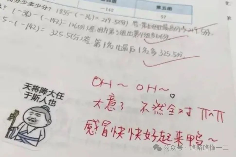 除了00后编写练习册答案很有意思外,00后老师的教学风格同样吸引人,给同学们试卷上留言,最后还不忘关心一下同学们感冒的病情。