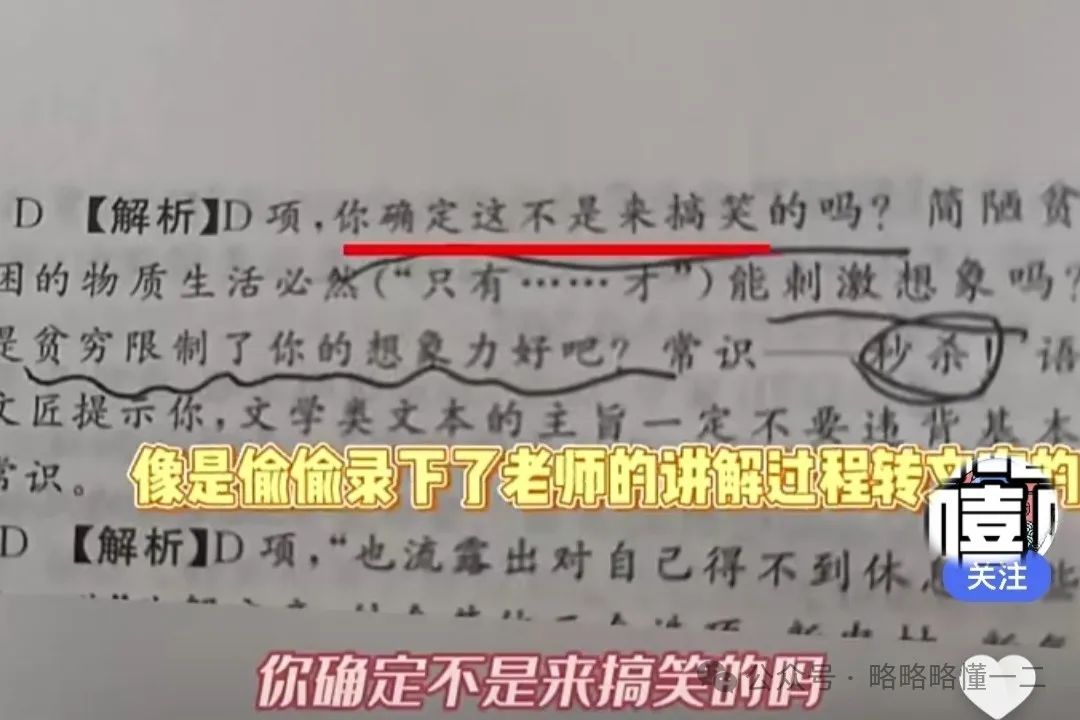 比如“你确定这不是来搞笑的吗?”、“贫穷限制了你的想象力”、“常识秒杀”等等,网友评论说像是偷偷录了老师讲解过程然后转文字的。
