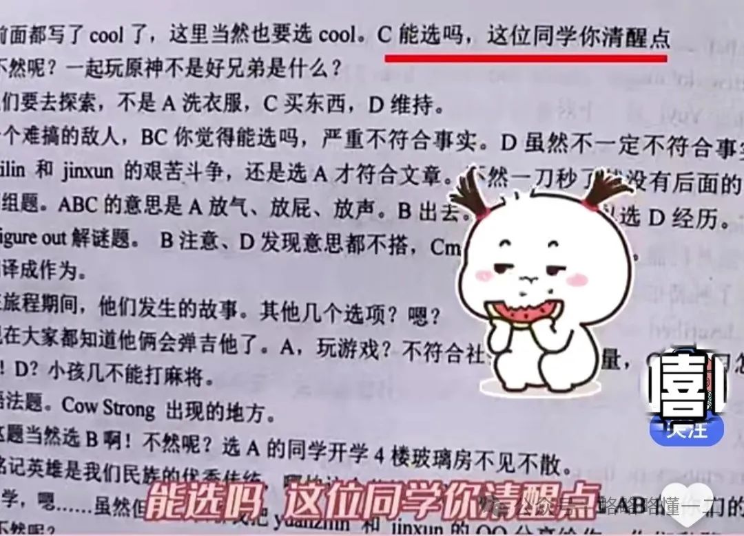 就连大家普遍认为枯燥乏味的英语题解析,都有了“趣味版”,在答案当中写“C能选吗?这名同学你清醒一点”,突然觉得被答案教育了一顿,但自己一点气都生不起来。