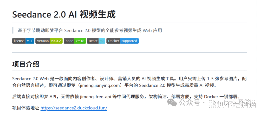引言即梦的Seedance 2.0不知道大家体验了没,因为模型的火热,自然也就有对应的项目出来了,今天要介绍的属于纯前端项目,后端直接对接的即梦的API,模型方面目前支持Seedance 2.0以及Seedance 2.0 Fast。