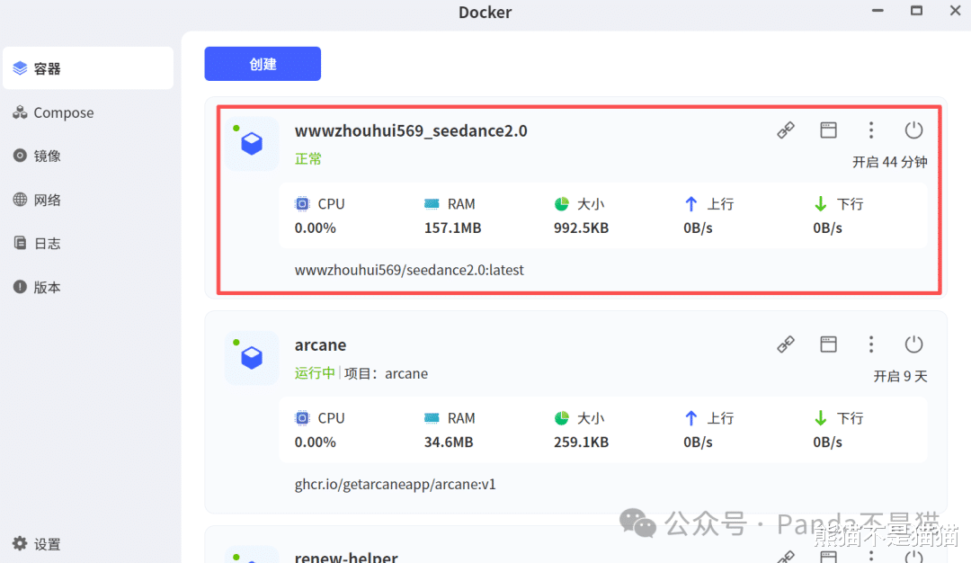 镜像名为wwwzhouhui569/seedance2.0:latest,直接用Docker中自带的镜像拉取下载即可,或者用Compose进行堆栈部署。