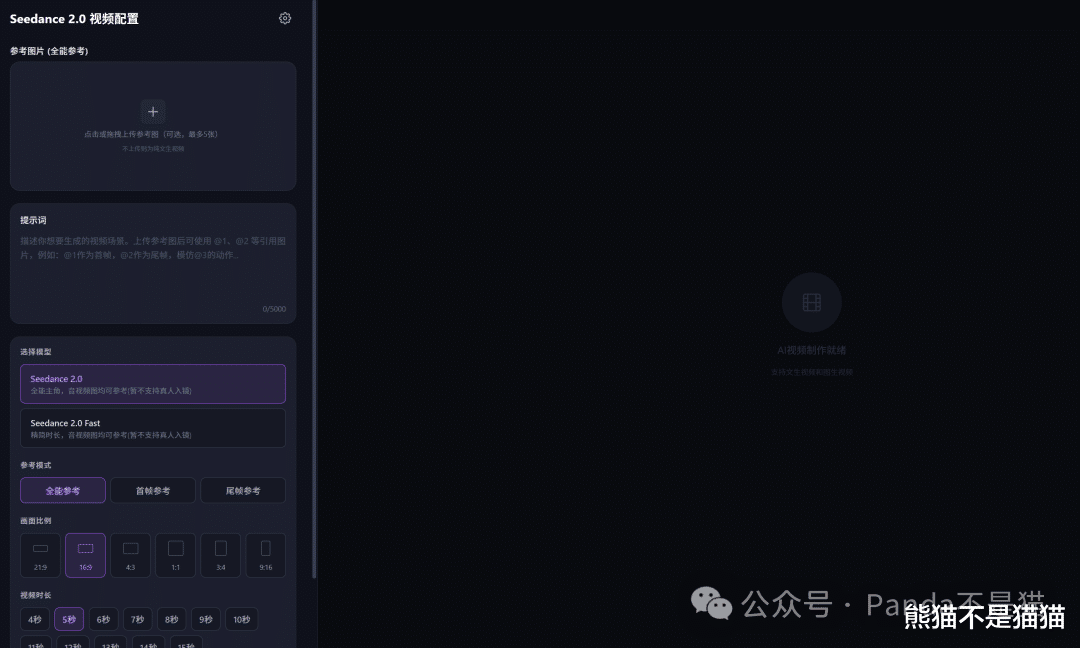 再往下可以设置模型,前面也提到了,目前两种Seedance都支持,同时在下方则是参考模式以及生成的画面比例和时间的调整。目前Seedance的费用并不低,5秒的视频大概积分是20左右,换算成正常的月卡会员差不多3-5元。