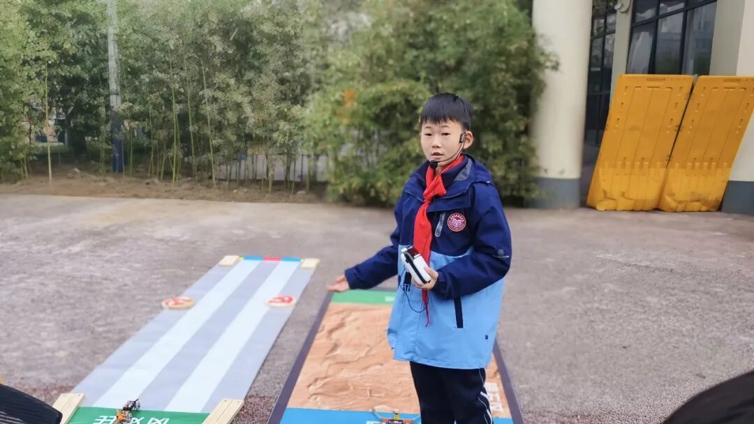 三(5)班张恩禾同学介绍说:“这个是我的参赛车辆——风力小车,终点有不同积分区,中间分最高,小车放在出发区到终点就能获得对应积分。这个是火星收集车,收集车的爪子需要我们自己设计,把中间放的小球推到终点就能得分,小球越多,得分越高。本学期我们代表学校参加了郑州市车辆模型锦标赛,拿了市级比赛的一等奖。”