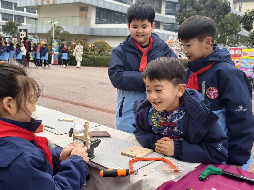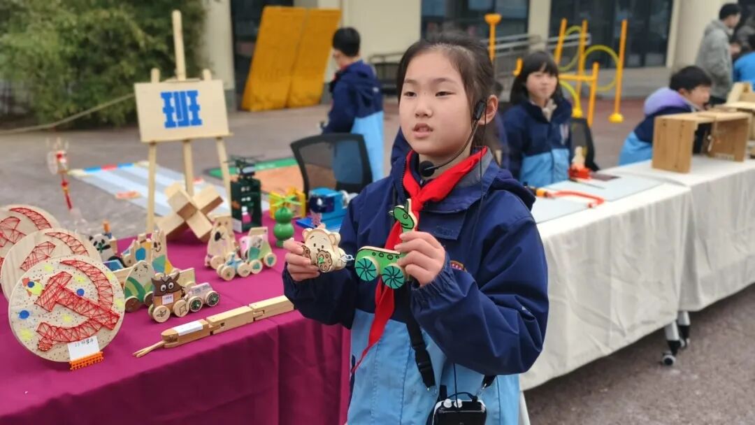 在“造创鲁班”社团展区,三(5)班曾梓申同学为观众们介绍本学期社团完成的工程作品:“在课堂上我们学习作品原理和分析结构,会使用多种工具比如线锯、台钳、锉刀、砂纸进行锯切,打磨,加入我们的创意涂装,把每一件作品变得与众不同。”