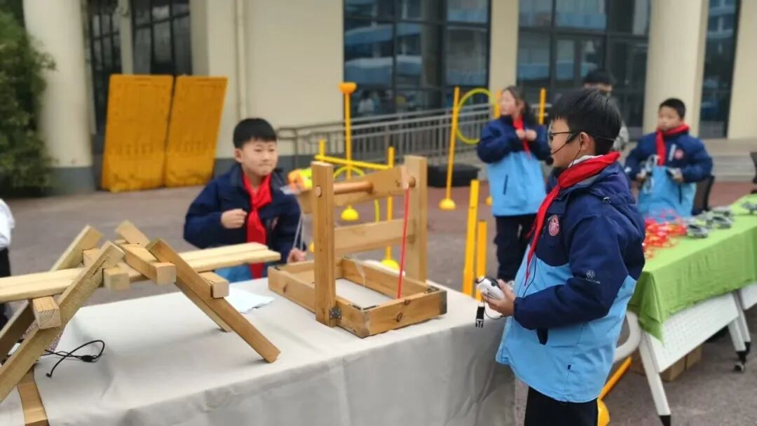 三(4)班赵毅辰同学介绍了好玩的投石车:“它利用皮筋弹力和杠杆抛射石块。操作时压下投石臂,放入炮弹,松开后皮筋将投石臂拉起,将炮弹抛出,通过调整投石臂的长短可以控制沙包的远近。下面,请张恩禾同学给大家演示一下……”