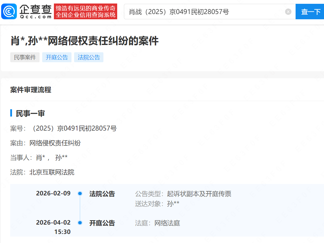 近日,据企查查APP显示,肖战与孙某某的网络侵权责任纠纷一案有了新进展。法院已向被告公告送达相关诉讼材料,该案定于2026年4月2日15时30分在北京互联网法院公开审理。