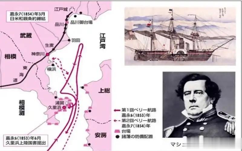 1853年7月8日,美国东印度舰队司令马修·佩里(Matthew C. Perry)率领四艘黑色蒸汽军舰,驶入江户湾(今东京湾)的浦贺海面,停泊于今神奈川县久里滨附近。次年(1854年)2月13日,佩里率七艘军舰重返,最终于3月31日在神奈川(今横滨)签订条约。