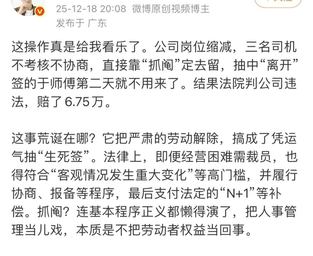 比如有网友表示,不考核不协商,直接靠抓阄定去留,这事荒诞在哪?它把严肃的劳动解除,搞成了凭运气抽「生死签」。抓阄?连基本程序正义都懒得演了,把人事管理当儿戏,本质是不把劳动者权益当回事。