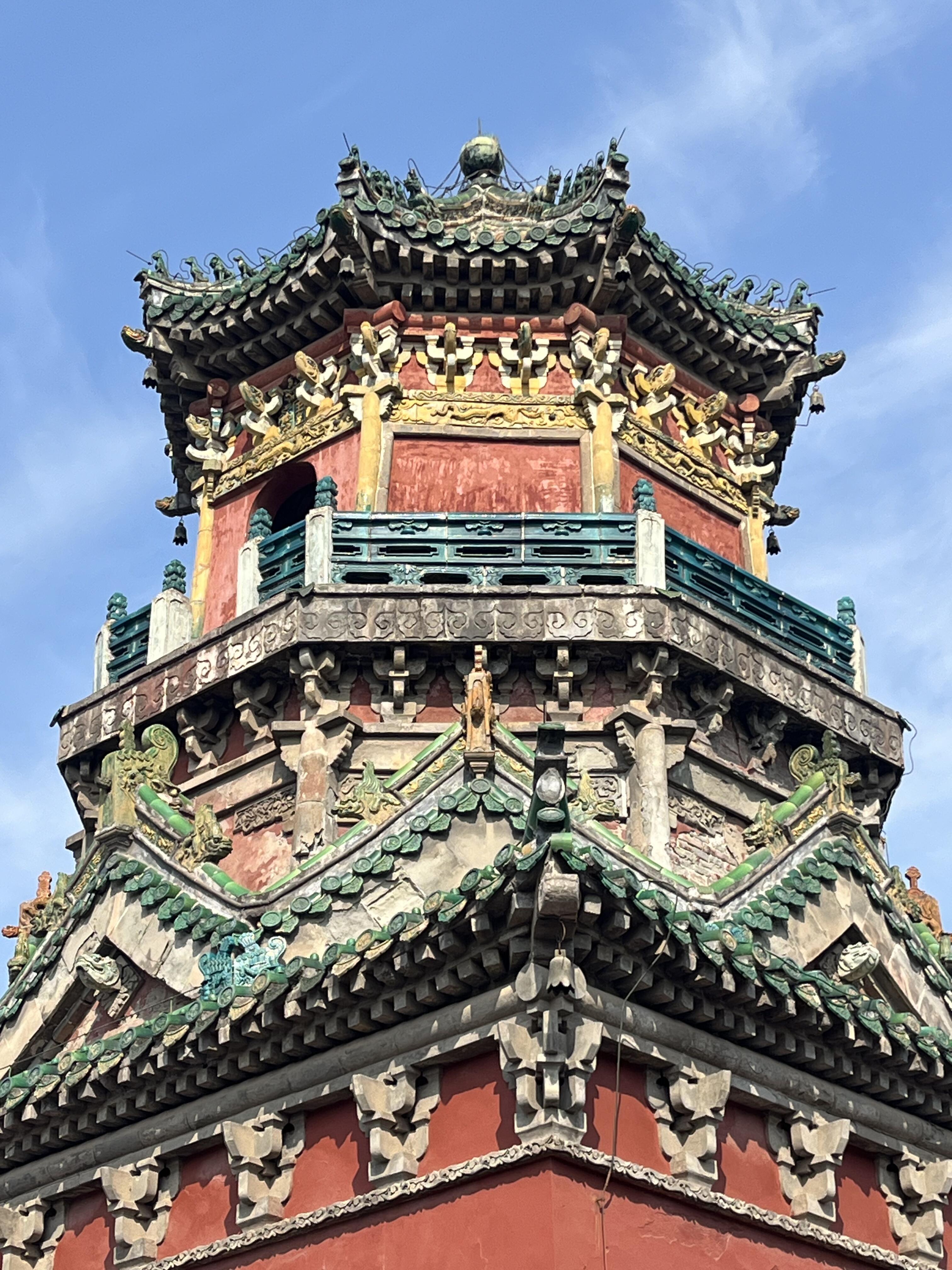 如今呈现在眼前的玉皇阁,是整座道观仅存的精华。13米的高度不算宏伟,却以独特的造型让人过目难忘。下阁上亭,下方上圆的结构,打破了传统建筑方正规整的范式。青砖层层叠砌,仿木结构的斗拱、梁柱、门窗皆用砖石雕琢而成,远看竟有几分木构建筑的灵动。这种将阁楼与蒙古包元素巧妙融合的设计,在中原大地上极为罕见,分明是元代多元文化碰撞的鲜活例证。