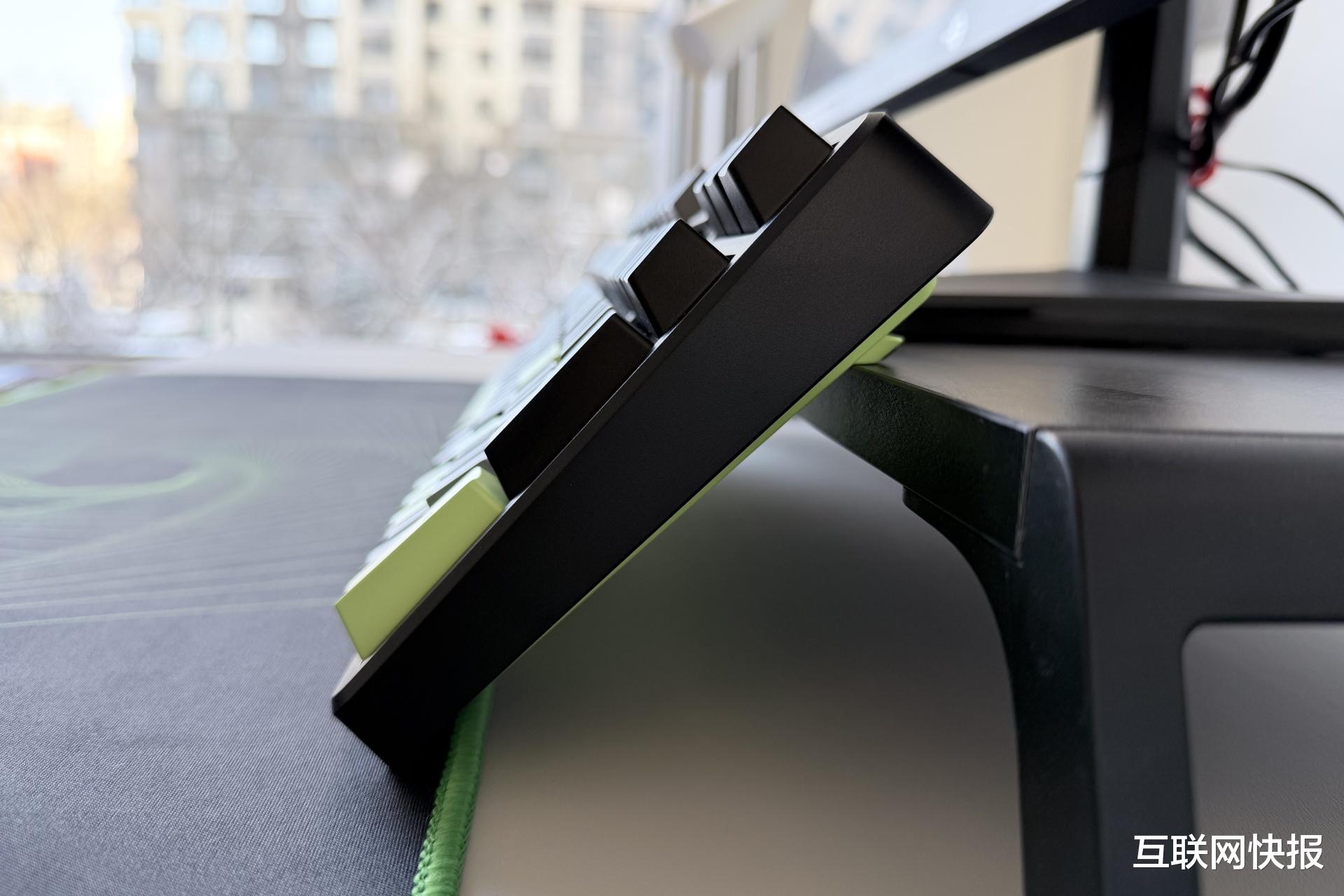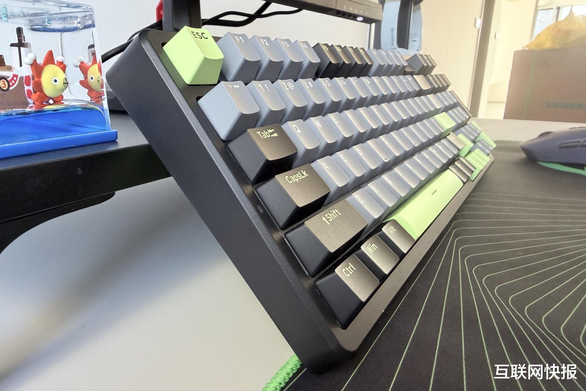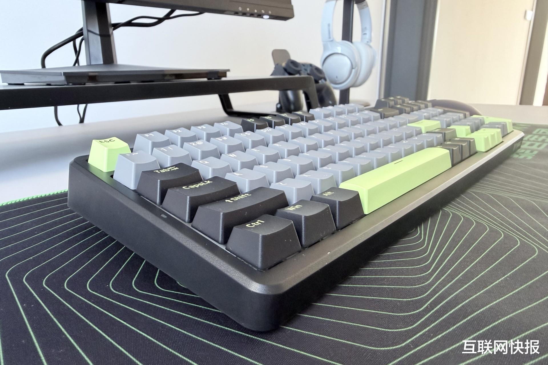 42mm 的机身高度搭配人体工学键帽坡度,不用额外配掌托,长时间打字也不会累腰。键帽是高含量 PBT 双色注塑的,触感扎实,还不容易打油,用久了也不会发亮。