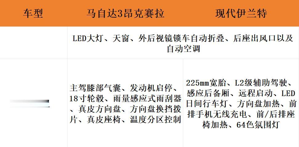 对比来看,两车的配置都能称得上丰富,马自达3昂克赛拉的配置大都集中在看不到的地方,对于驾驶体验和实际的使用感受有帮助,而现代伊兰特在科技感以及舒适性配置方面下了更多的功夫,配置来的更为“讨喜”。