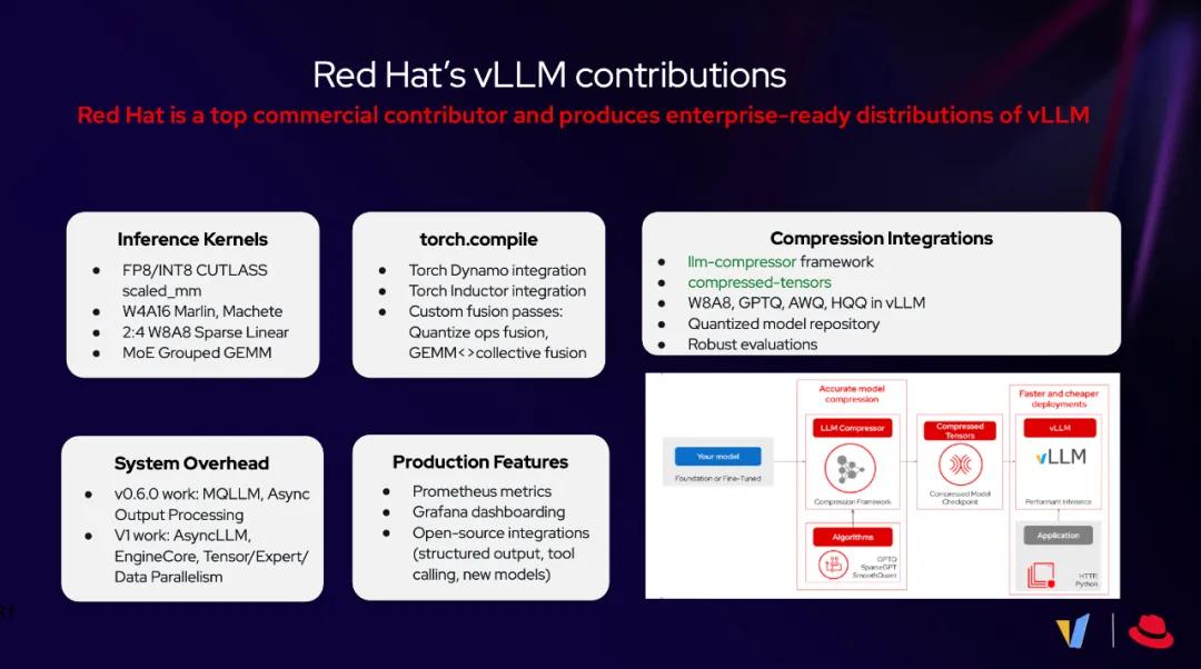 红帽作为vLLM的核心商业贡献者,不仅推动其技术发展,还提供企业级发行版。红帽认为,推理引擎是AI OS的核心,其致力于将vLLM打造成“AI时代的Linux”,成为连接硬件与应用的通用层,帮助企业降低成本、提升GPU利用率。
