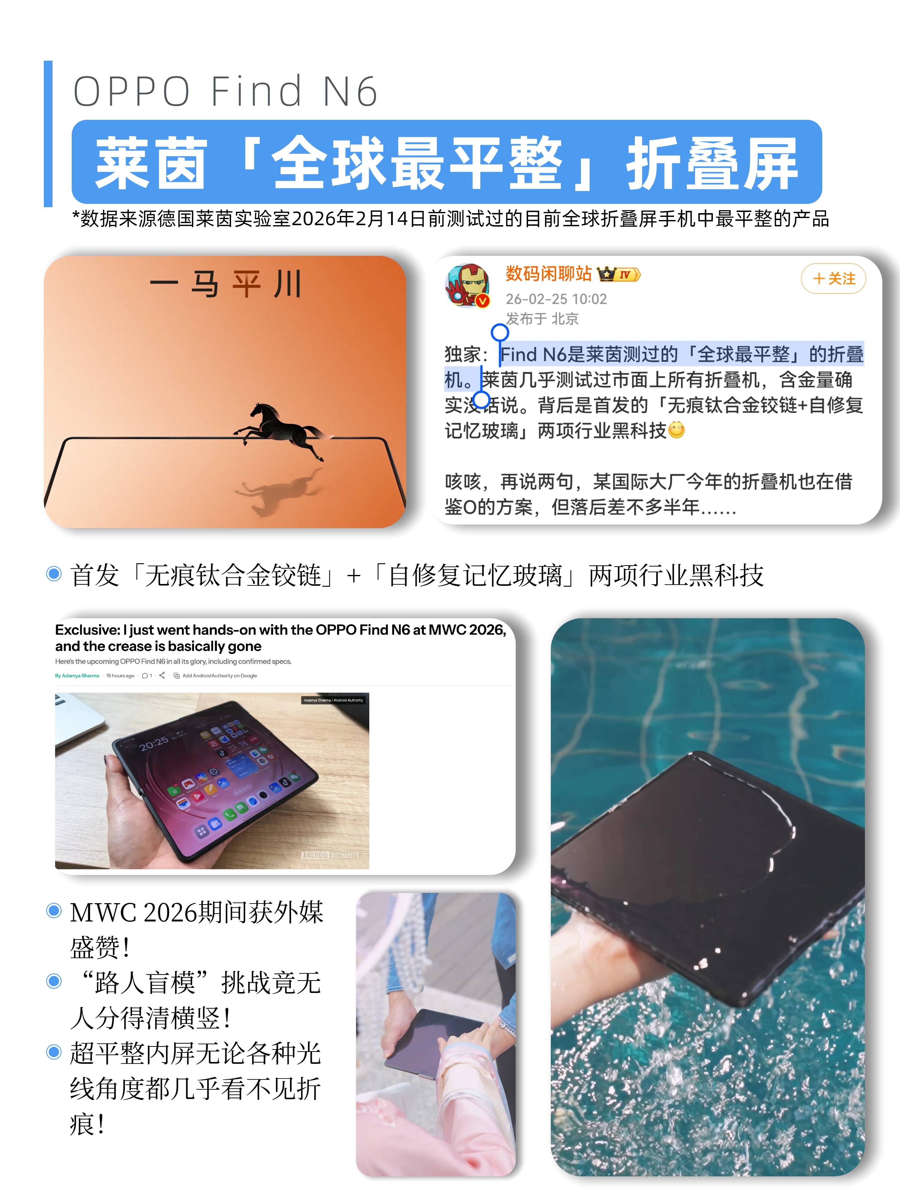 都在传iPhone Fold会是「近乎无折痕」,但有博主爆料其实🍎也在借鉴OPPO的方案~Find N6主打的就是「一马平川」,首发「无痕钛合金铰链」+「自修复记忆玻璃」两大黑科技,是莱茵测过的“全球最平整”折叠屏!平整到什么程度呢?在MWC 2026展会上被外媒盛赞“几乎看不见折痕”,周意保的路人盲摸挑战中也是几乎所有参与者都分辨不出横竖🤣