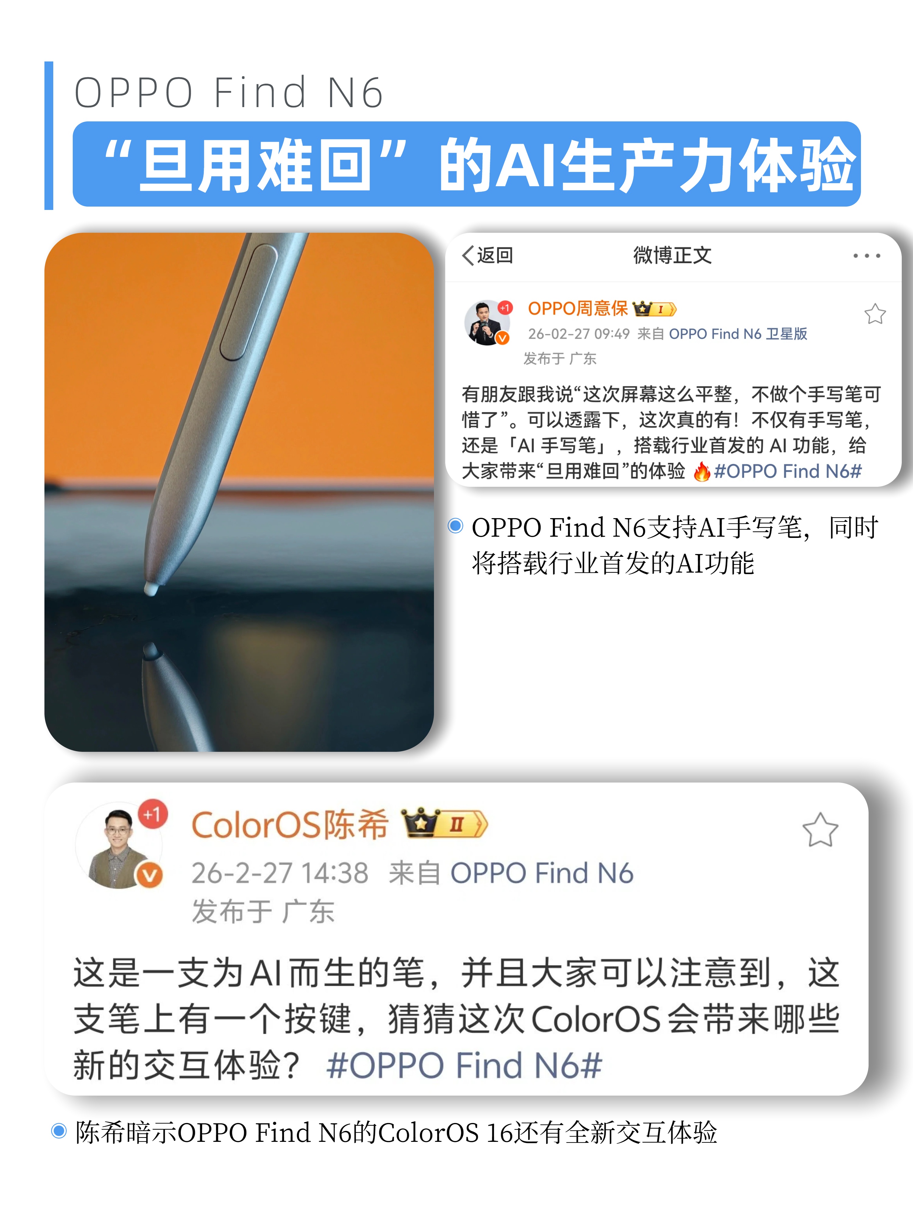 既然屏幕如此平整,配上一根AI手写笔再合适不过~OPPO Find N6的书写体验肯定会很丝滑,关键是还将首发全新AI功能,还有ColorOS也会带来全新交互,流畅度更是行业数一数二的水平,大屏体验值得期待一波!