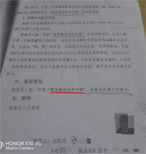 相关鉴定材料显示,张某华被评定为 “重度精神发育迟滞”,目前无民事行为能力;2023 年 11 月 20 日的诊断证明书也载明其多项患病情况,需要持续医疗支持。