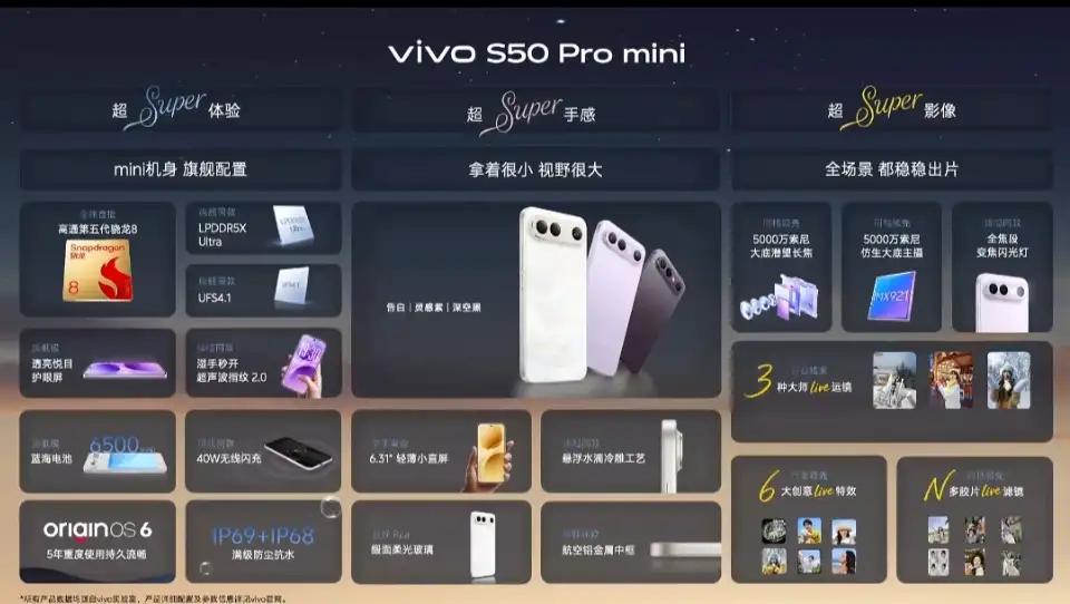 产品定位的精准分化彰显了vivo对市场的深刻理解。面对小屏旗舰复兴的趋势,S50 Pro mini以6.31英寸机身搭配第五代骁龙8处理器,在191g的轻巧机身中塞进6500mAh大电池与40W无线闪充,彻底打破了小屏机“性能弱、续航差”的固有痛点。而标准版则以6.59英寸均衡尺寸、第三代骁龙8s芯片,将IP69+IP68双防水、超声波指纹等旗舰配置下放到3000元档,重塑了同价位“满配”标准。这种双机型策略既覆盖了小屏爱好者与全能需求用户,又通过清晰的配置梯度避免了内部竞争,实现了对细分市场的精准覆盖。