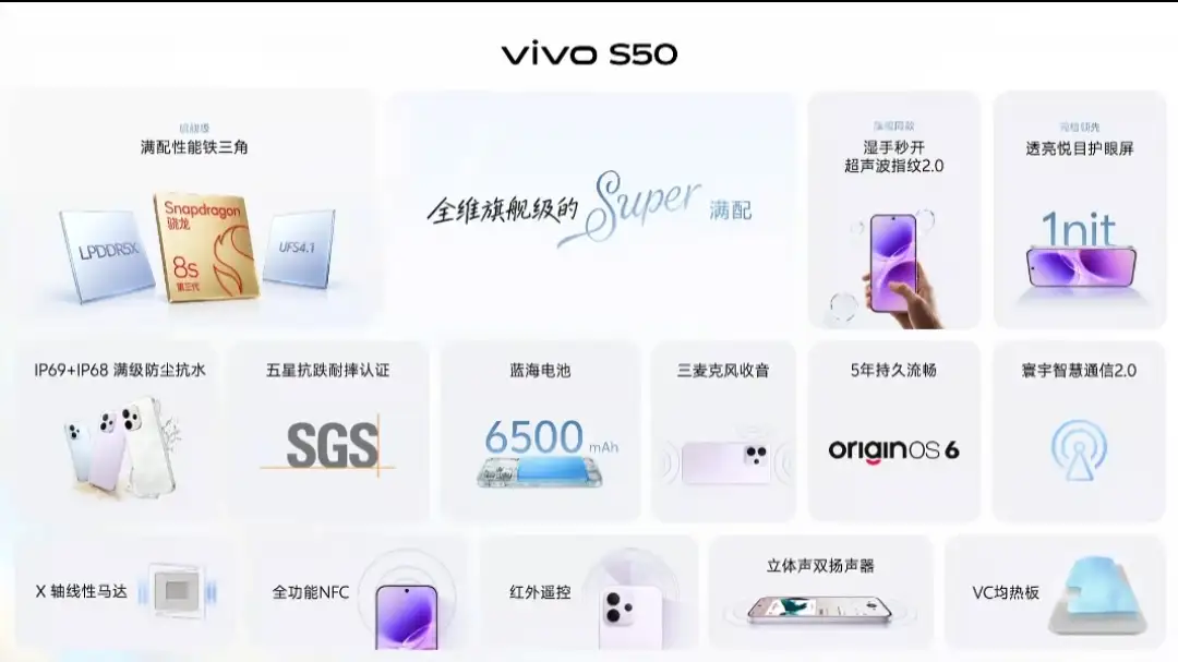 体验的全面均衡让S50系列具备了长期使用价值。性能上,满配的LPDDR5X内存与UFS4.1存储,配合4200mm²超大VC液冷散热,确保高负载场景下的稳定输出;续航方面,6500mAh蓝海电池搭配90W闪充,解决了用户的核心焦虑;细节处,4320Hz高频PWM调光护眼屏、X轴线性马达与立体声双扬声器,构建了无短板的日常体验。更重要的是,OriginOS 6的流畅优化与跨设备协同能力,让手机不仅是独立终端,更成为生态互联的核心,这种从单点优势到系统能力的升级,正是中端旗舰应有的水准。