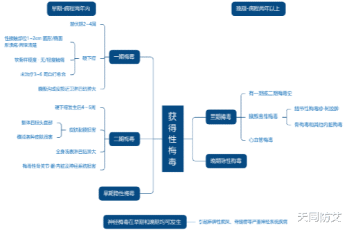 获得性梅毒:根据病程是否超过两年,分为早期梅毒(一期梅毒、二期梅毒、早期隐性梅毒)及晚期梅毒(三期梅毒、晚期隐性梅毒等)。神经梅毒在早期及晚期均可发生。不同类型的梅毒临床表现各不相同。