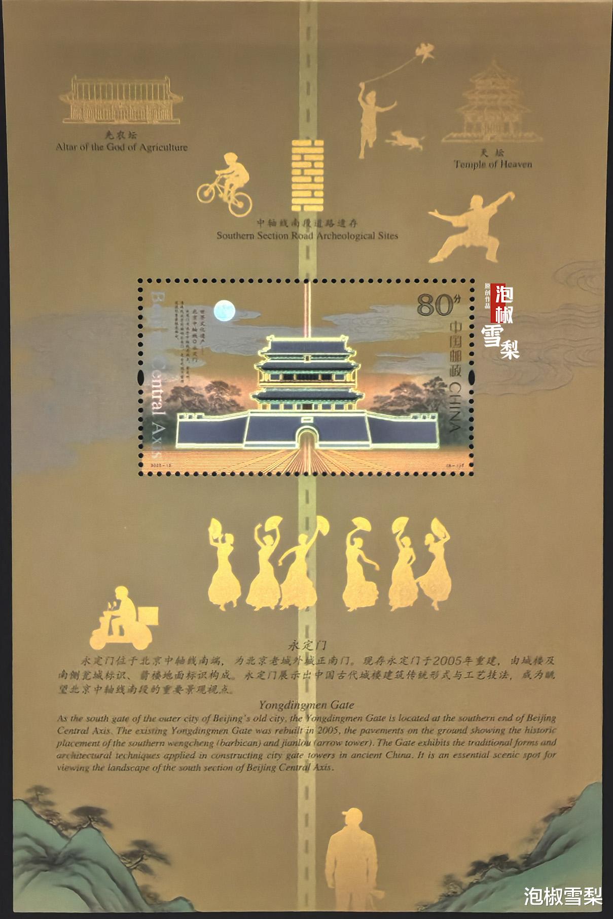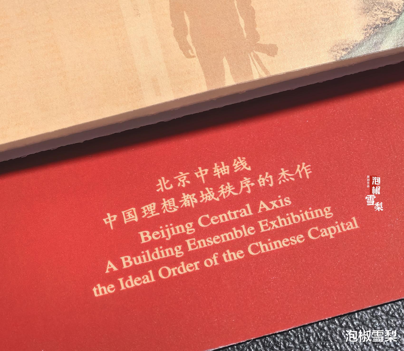 外壳为三折叠设计,长卷邮票贴于中间,左侧中部压舌印有篆书“北京中轴线”五个字,辅有英文名称及中国邮政铭记。