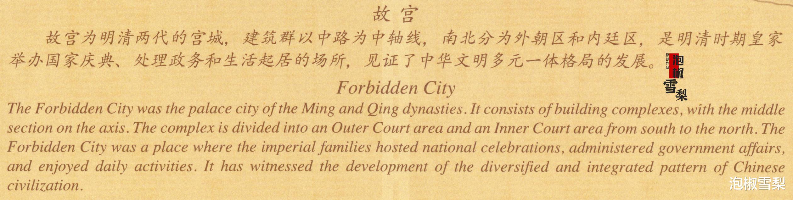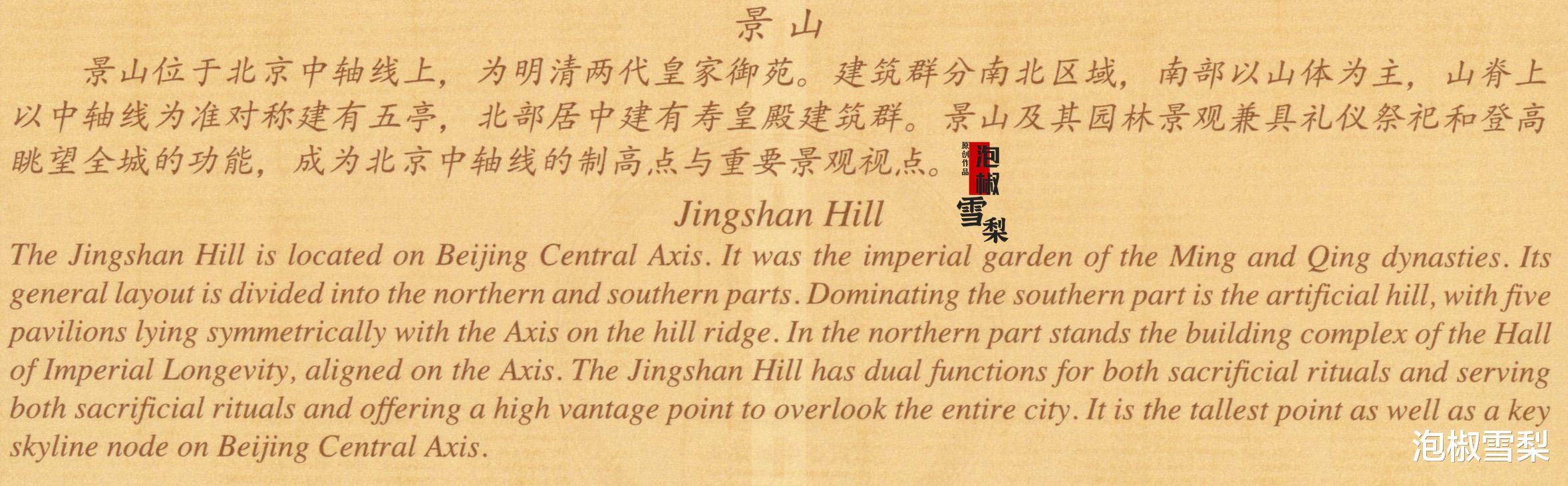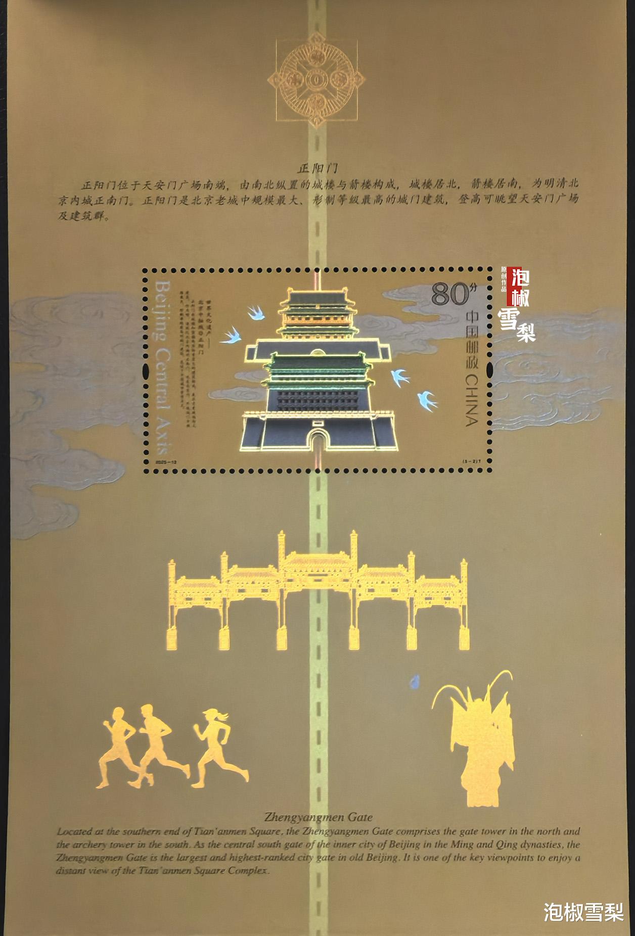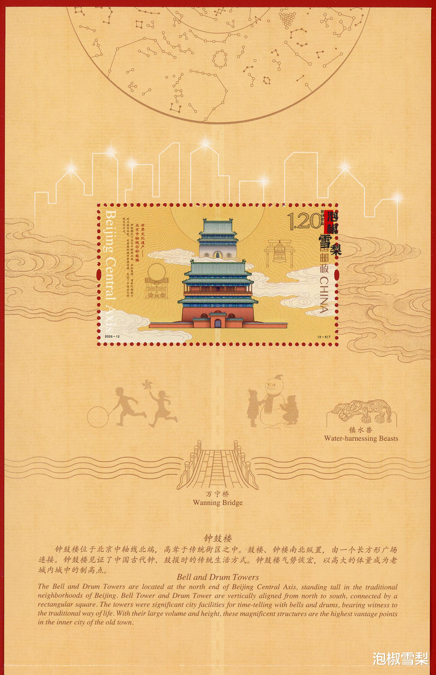 每一枚边纸上都有中英文介绍,附近则印有中轴线附近的著名建筑。