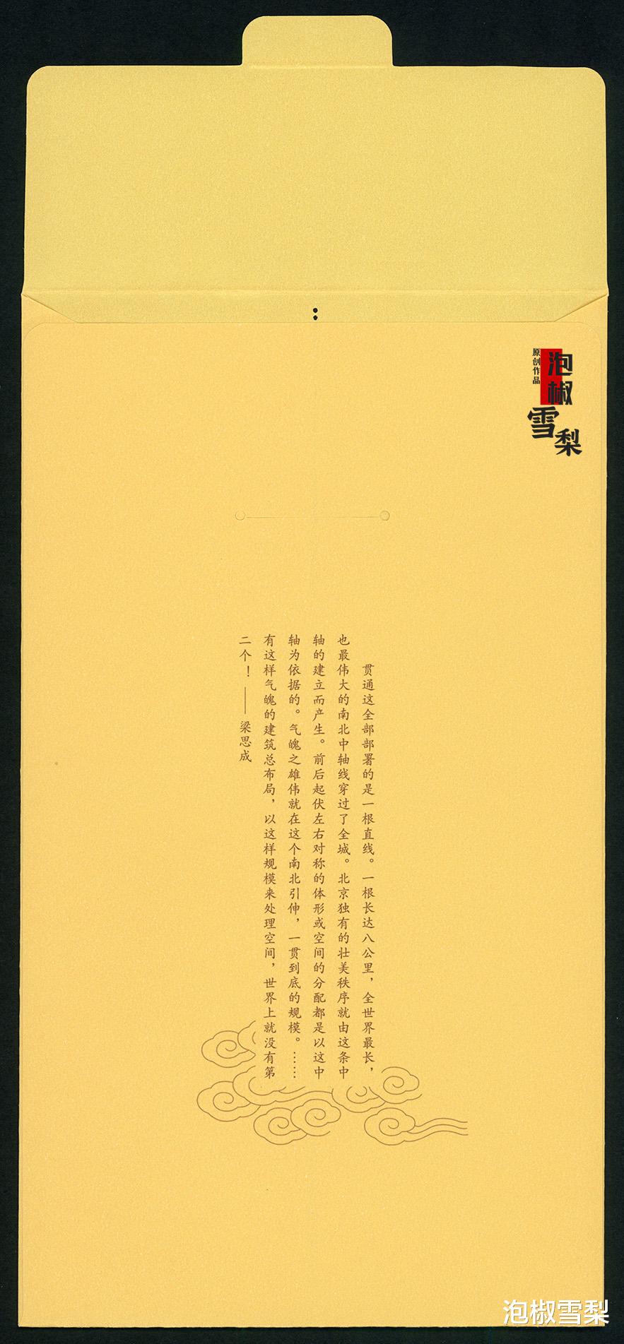 背面文字选自梁思成先生在1951年4月15日发表的文章《北京——都市计划的无比杰作》,文字下部为祥云图案。