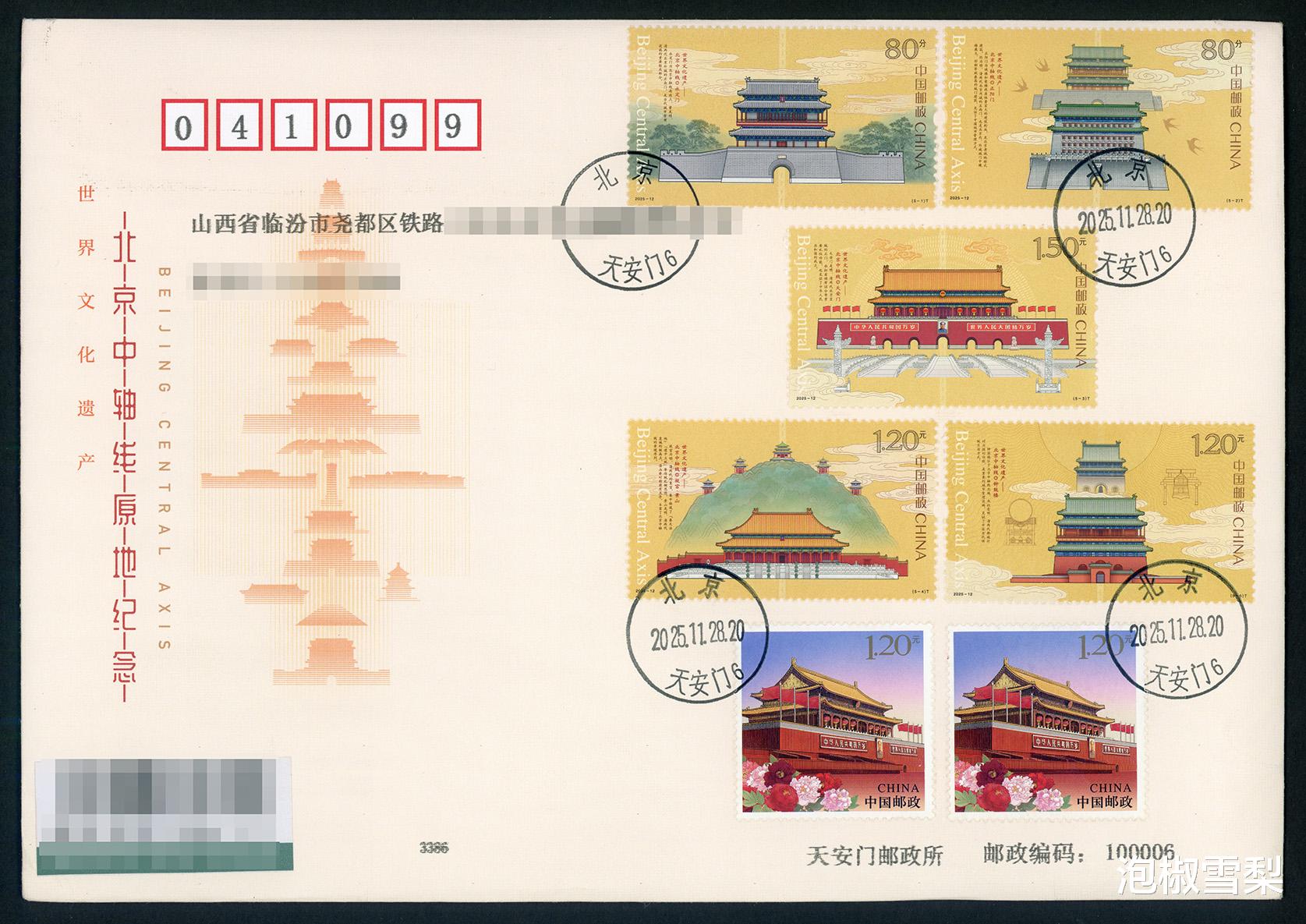 信封右上角贴有全套《北京中轴线》邮票和两枚改版《天安门》个性化邮票,总面值7.9元,按照老一辈集邮者的观点,超了0.1元,不符合资费。