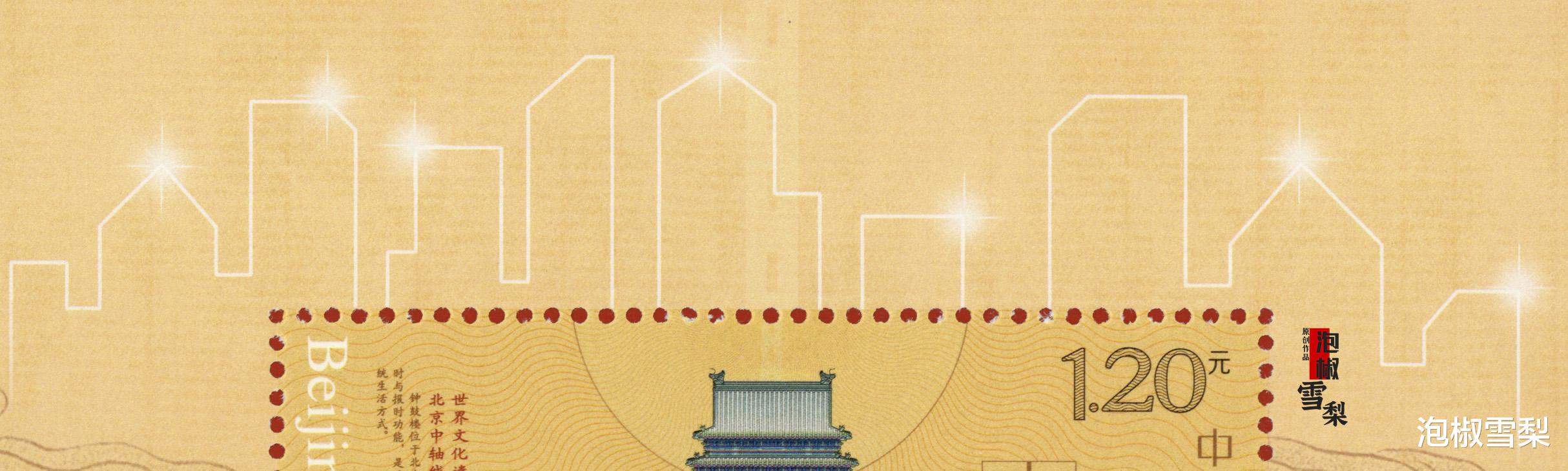 最后就是人物剪影的加入,个人觉得人物剪影是这套邮票最不搭的设计,虽然各行各业和男女老幼让邮票有了人文气息,但像电动车、现代舞、单反相机、背包客这样的元素,本身就和中轴线上的古建筑格格不入,尤其是第三枚,影响了整体的庄重感。