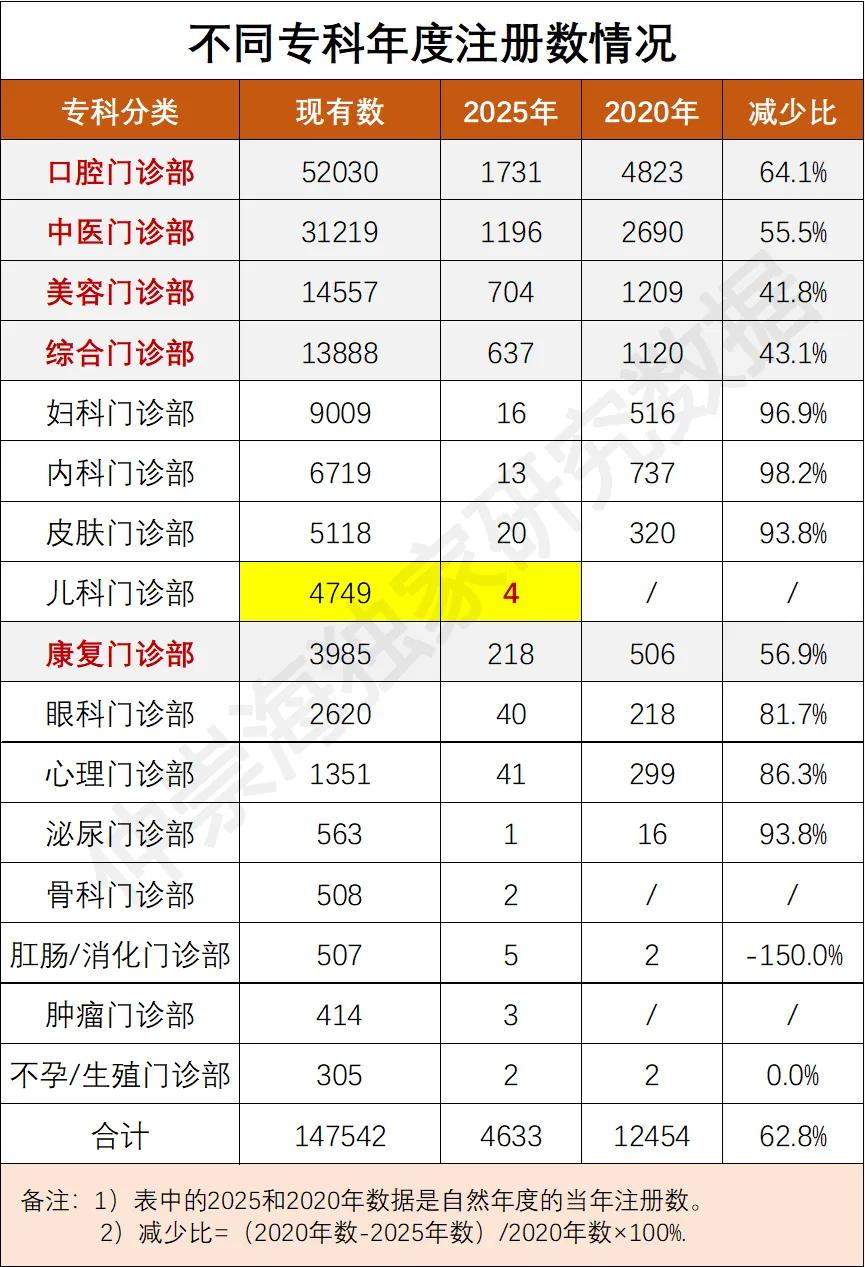 • 儿科门诊部总注册数达 4739 家(远超康复门诊部),但 2025 年新注册数仅 4 家,成为最 “冷清” 的专科之一;
