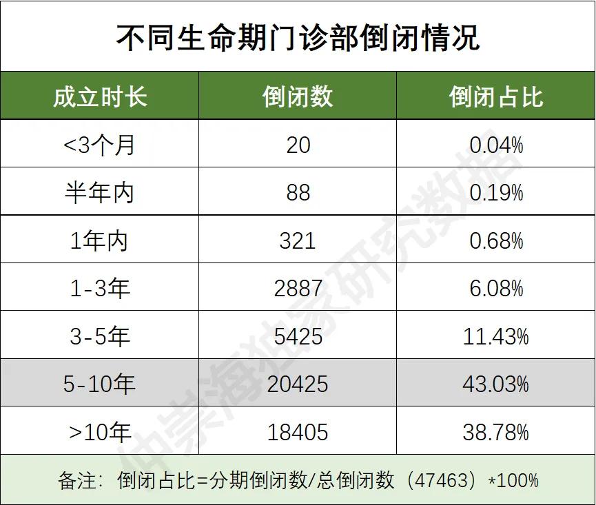 成立年限与倒闭率:我国最早的门诊部注册于 1983 年,但倒闭率最高的是成立 5-10 年的机构,这一阶段成为门诊部生存的 “生死线”。