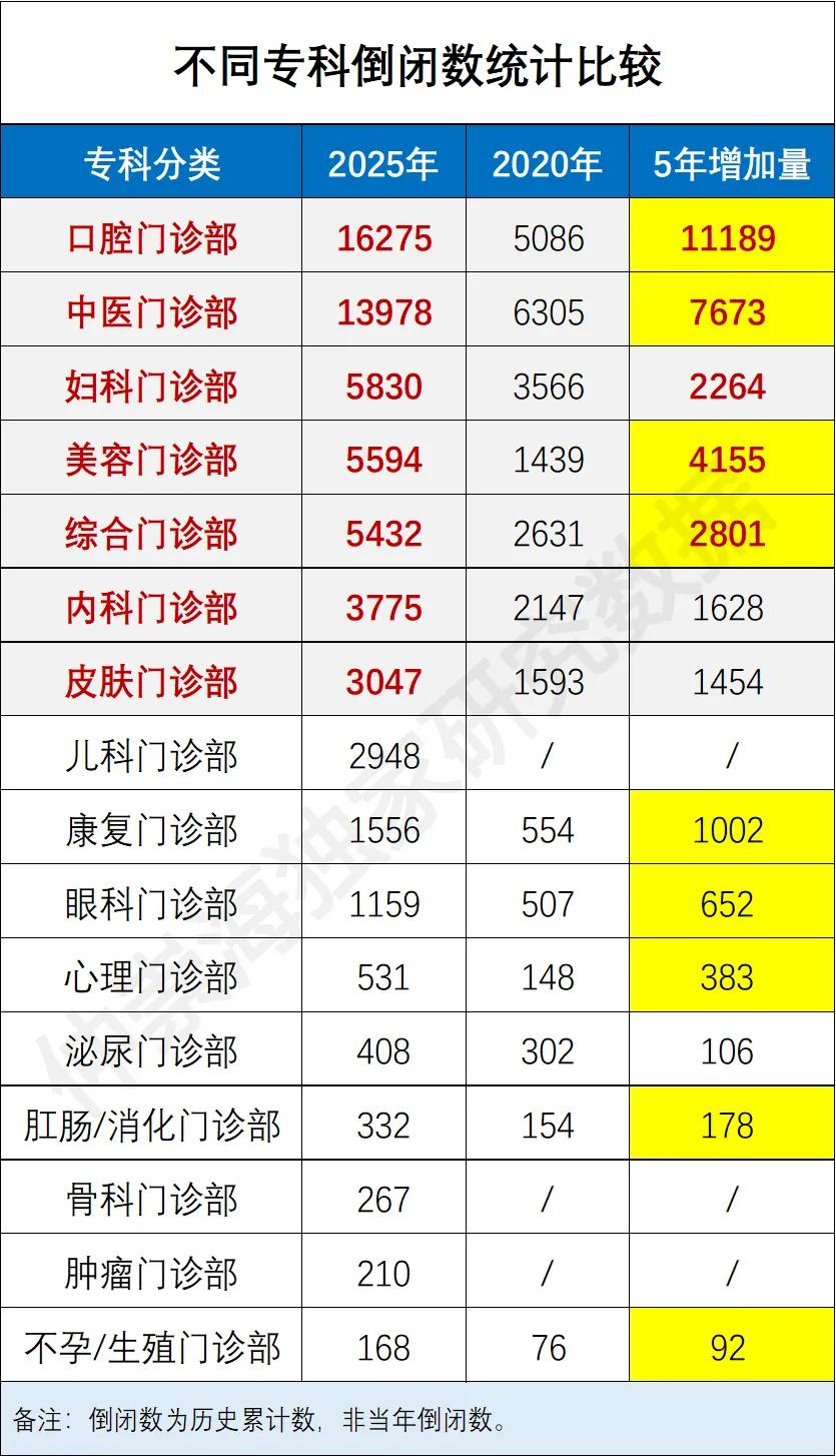 更值得警惕的是,有 9 个专科近 5 年的倒闭增量,已经超过了 2020 年之前的累计倒闭数。