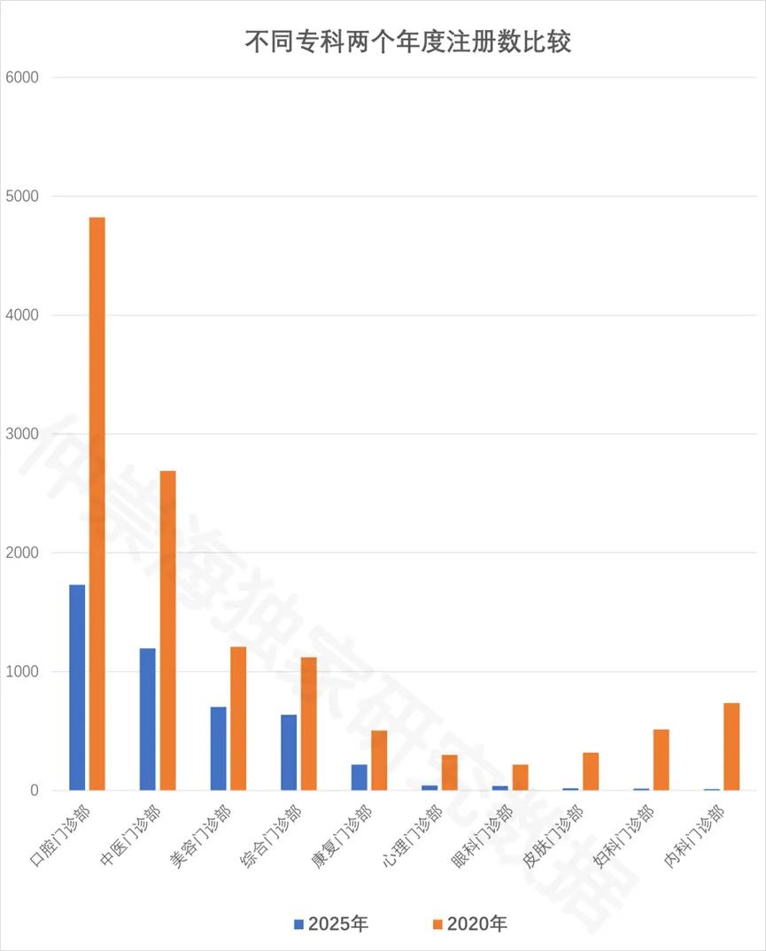 • 2020 年有 10 个专科新注册数超 100 家,2025 年仅剩口腔门诊部、中医门诊部、美容门诊部、综合门诊部、康复门诊部 5 个;