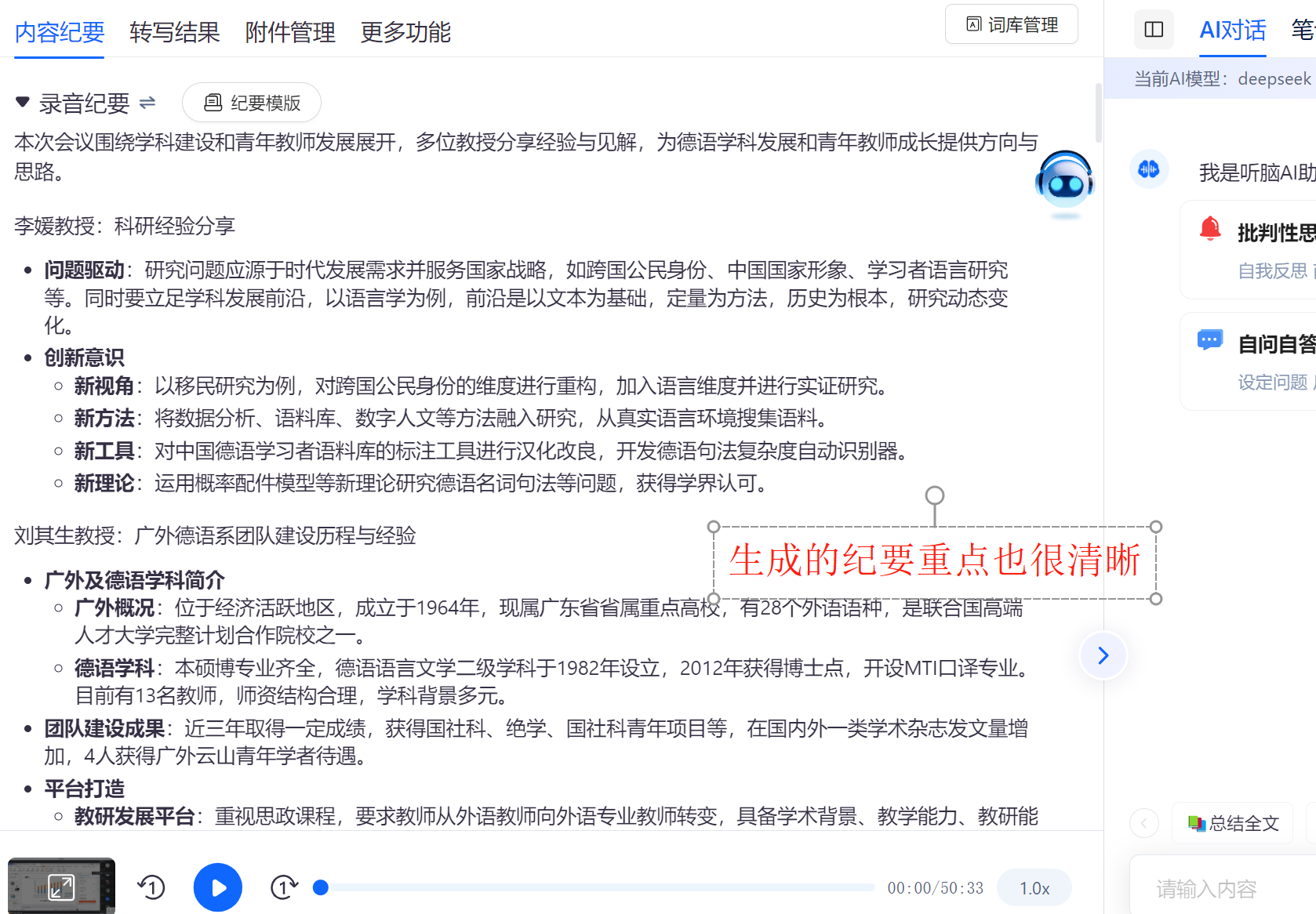 用问答找重点:转完纪要后,我常问 “这里提到的医保缴费有几个时间点?”“鱼塘承包的争议点是什么?”,它会直接从文本里提取关键信息,比我自己逐行找快太多;