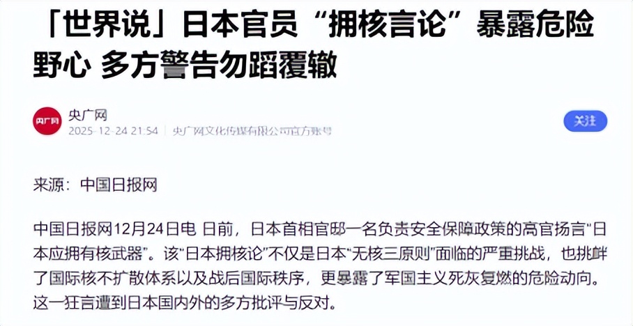央广网《「世界说」日本官员“拥核言论”暴露危险野心 多方警告勿蹈覆辙》