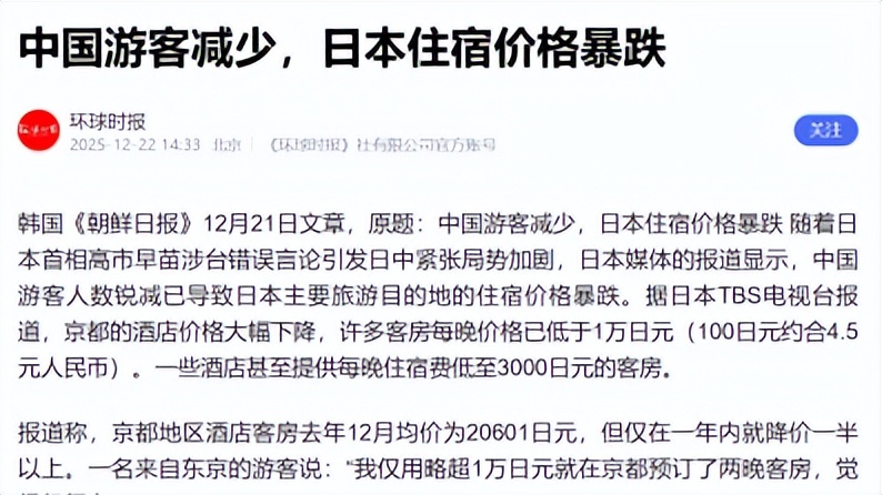 环球时报《中国游客减少,日本住宿价格暴跌》
