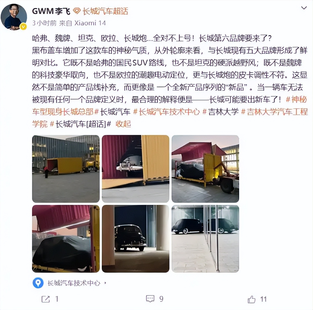 根据李飞的配文,新品牌与哈弗、魏牌、坦克、欧拉、长城炮全对不上号,而是一个全新产品系列中的“新产品”。