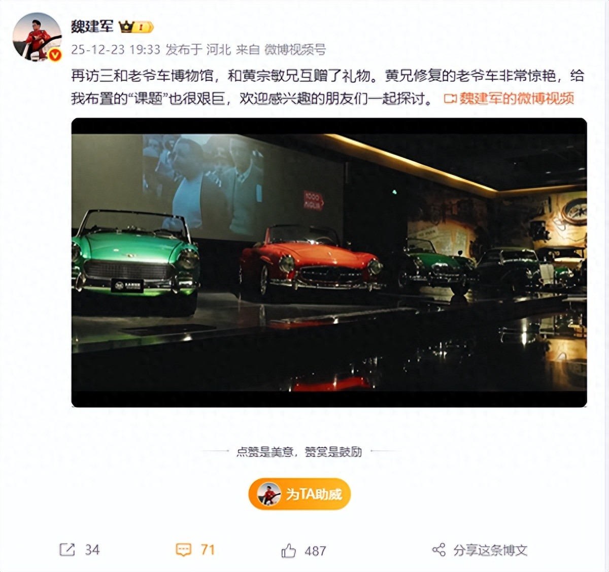 快科技12月25日消息,近日,长城汽车魏建军发布了一组与成都三和老爷车博物馆联动的纪录片。