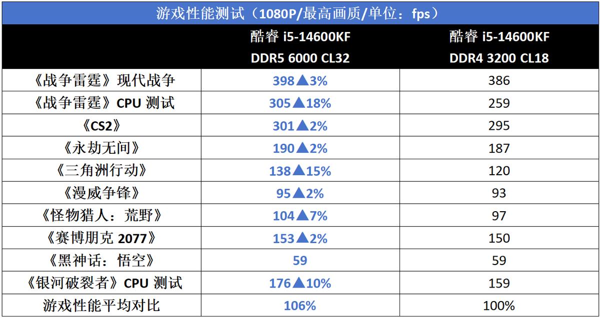 总结:根据自己预算情况,按需选择先总结一下上面的测试情况,酷睿i5-14600K+DDR5 6000时无论是内存带宽还是延迟时间都优于酷睿i5-14600K+DDR4 3200。在实际游戏中,得益于大带宽和低延迟,酷睿i5-14600K+DDR5 6000可以获得最高18%的游戏帧率领先,游戏性能平均领先6%。可以说在在性能上,酷睿i5-14600K+DDR5 6000的表现完胜酷睿i5-14600K+DDR4 3200。