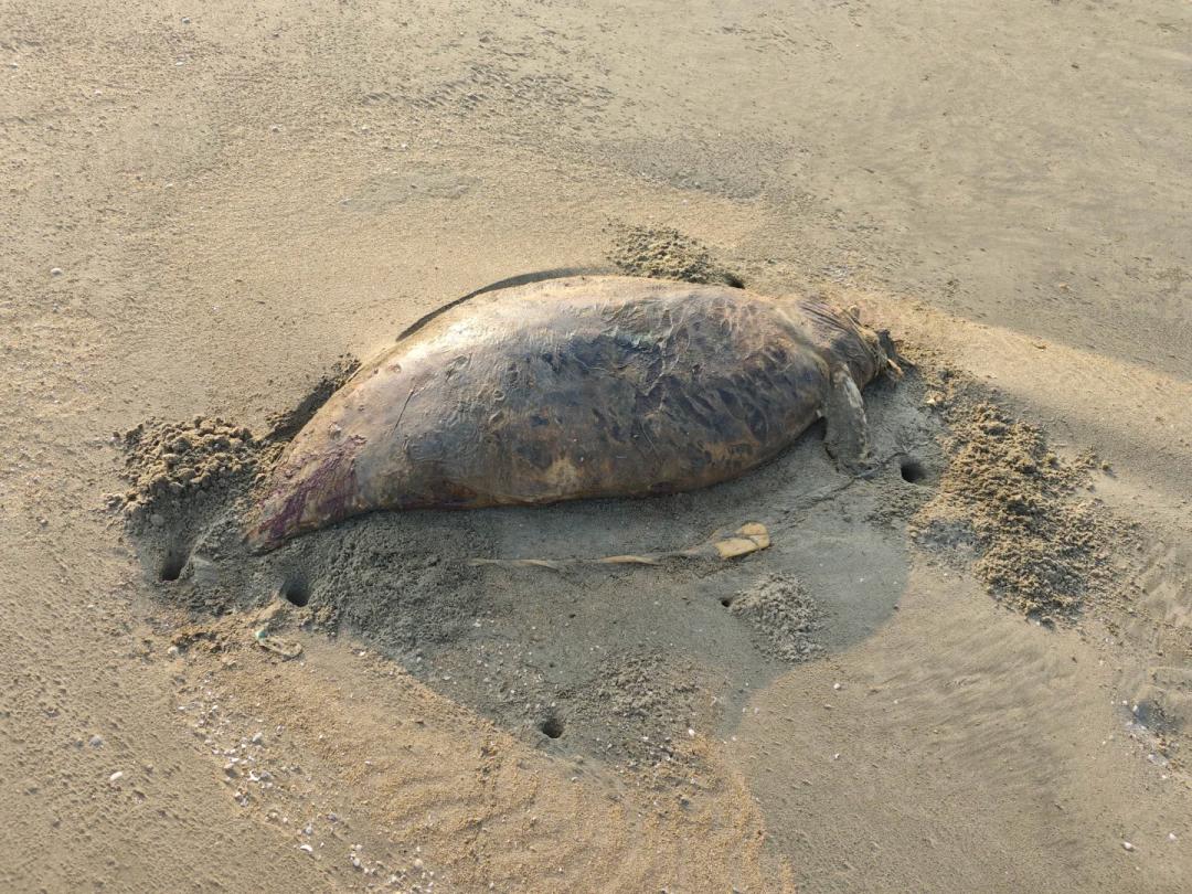 这具疑似儒艮的动物尸体,是部分观鸟爱好者在2月12日早晨发现的。当时他们前往湛江一处海滩观鸟,在滩涂上发现一具失去头颅的海兽尸体,随即拍摄照片并联系专业人员,等待物种鉴定。