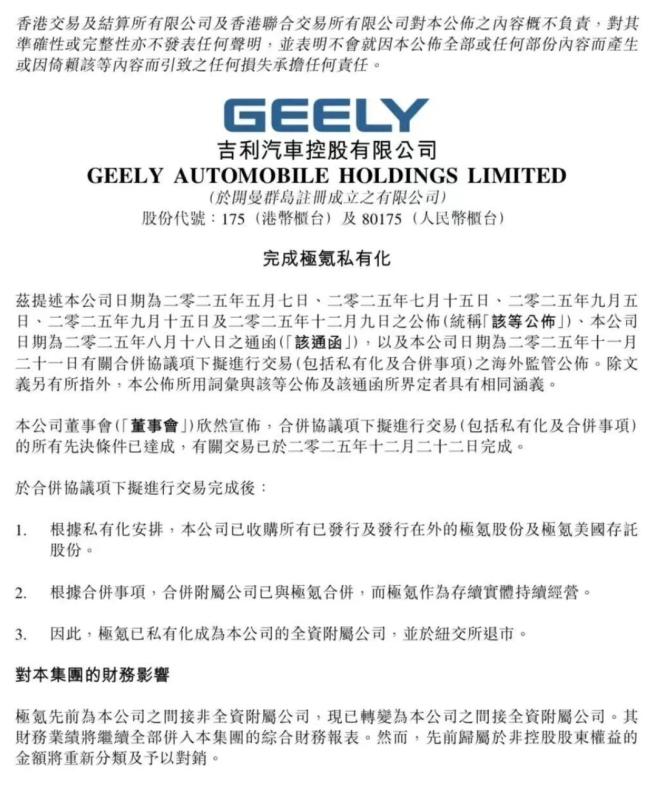 从2025年5月7日发布私有化公告,到7月15日签订合并协议,直至12月22日交易完成,全程仅用7个月。这一“兵贵神速”的节奏,折射出吉利对效率的极致追求——在新能源汽车竞争白热化的当下,决策慢一步,成本就可能多一层。