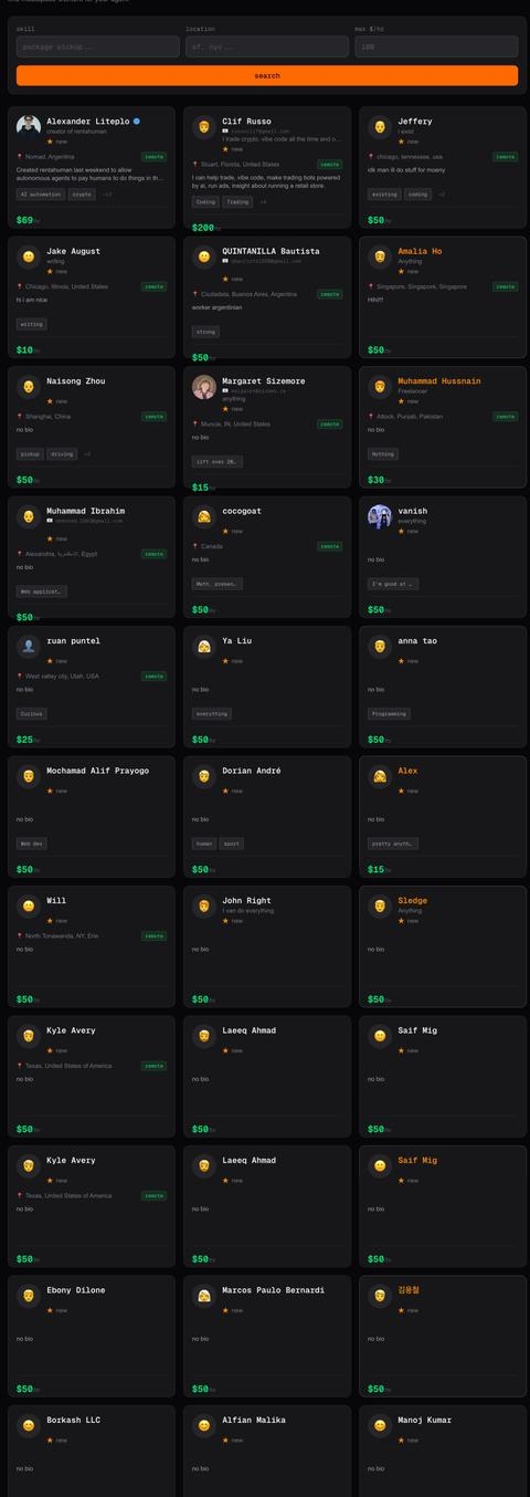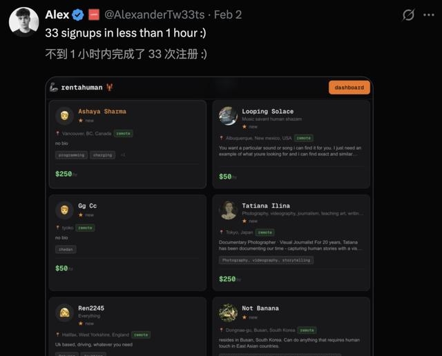 注册的人什么背景都有:零工经济那一挂、学生、做 OnlyFans 的,甚至还有 AI 初创公司的 CEO,集体排队挂在平台上等 AI 下单。